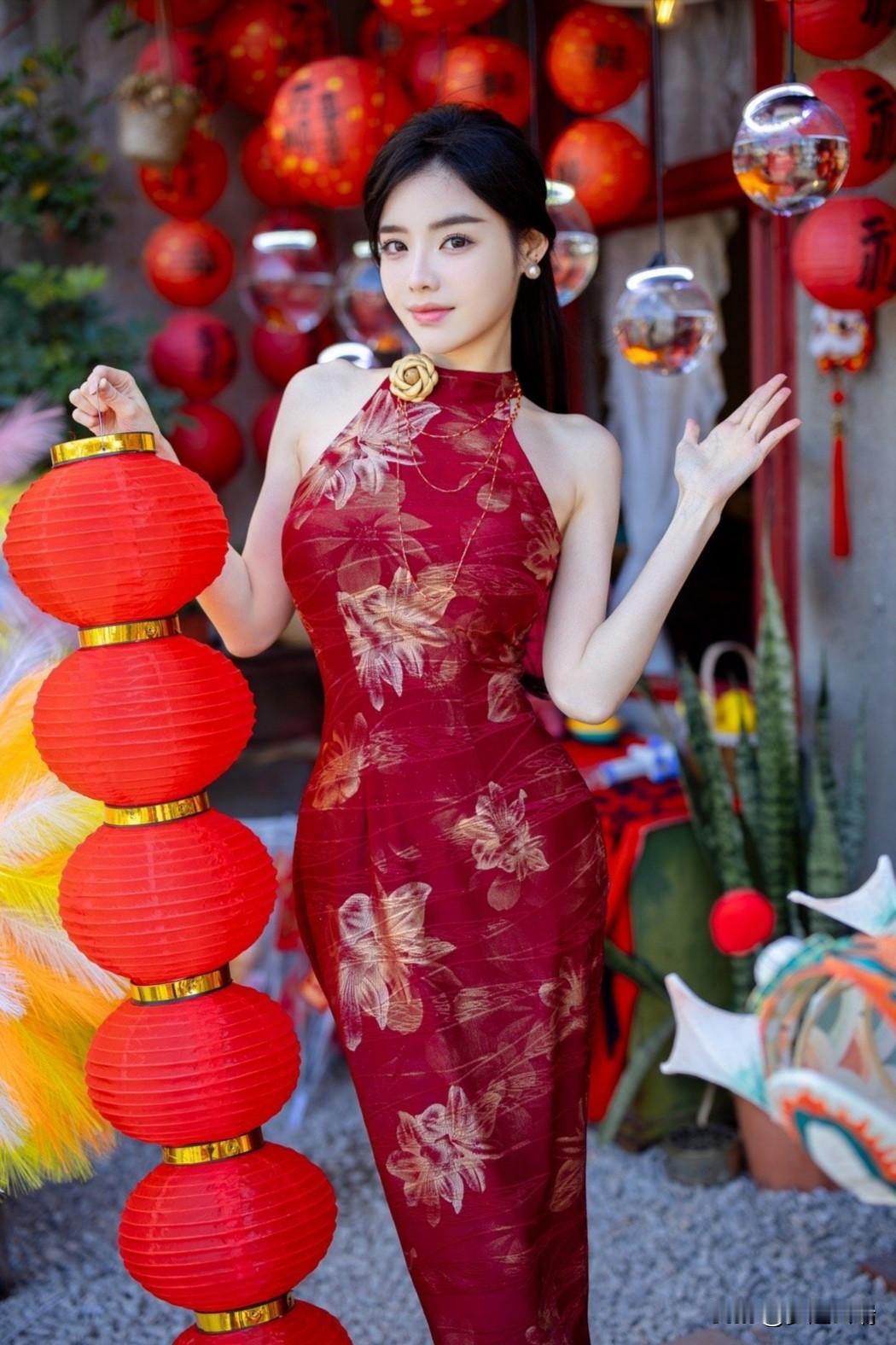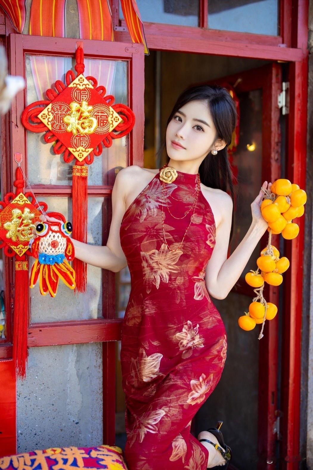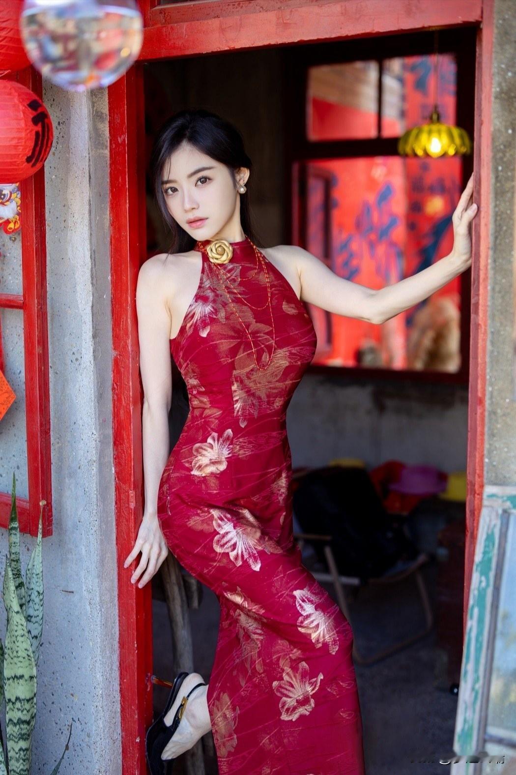 红衣美人倚门立,春意盎然满庭芳。