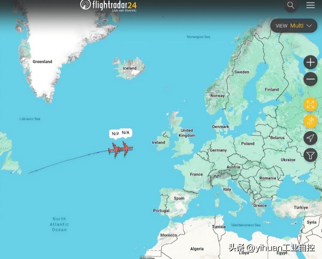 两架美军E-3B“哨兵”预警机正在跨越北大西洋海域,飞行目标地应该是中东地区,多