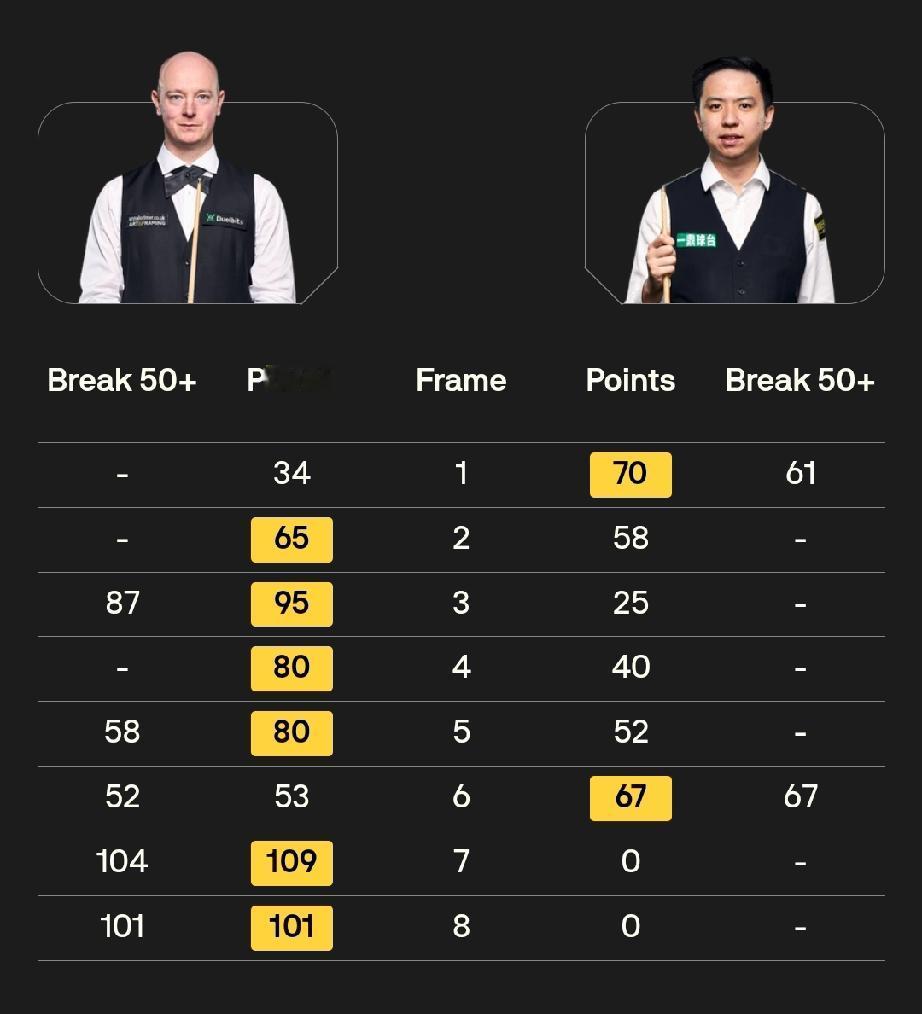 肖国栋输得确实有点“憋屈”,主要是对手克里斯·韦克林手感太烫了,全程火力压制。简单说就是:开局领先,中间打出“四连鞭”,最后被两杆破百直接“送对手回家”。 比赛进程: 第1局(肖国栋 1-0):肖国栋开局手感不错,单杆61分拿下开门红。 第2局(1-1):肖国栋本来有机会赢,但打丢了制胜的粉球,被韦克林65-58极限逆转。这一局没拿下非常伤士气。 第3-5局(1-4):韦克林彻底打疯了,连轰单杆87分、58分,连赢三局,直接把肖国栋打懵了。 第6局(2-4):肖国栋缓过劲来,单杆67分扳回一局,算是止住了血。 第7-8局(2-6):韦克林没给任何机会,直接开启“终结模式”,连续打出单杆104分和101分两杆破百,干净利落地结束了比赛。 全场比赛,克里斯·韦克林轰出2杆破百+3杆50+,这种火力在短局制比赛里基本是无解的。 肖国栋第2局那个粉球没打进,直接让对手起势了。在高手对决里,这种机会没抓住,后面就很难翻盘了。 总之,肖国栋虽然输球,但是不窝囊,对手无解发挥!
