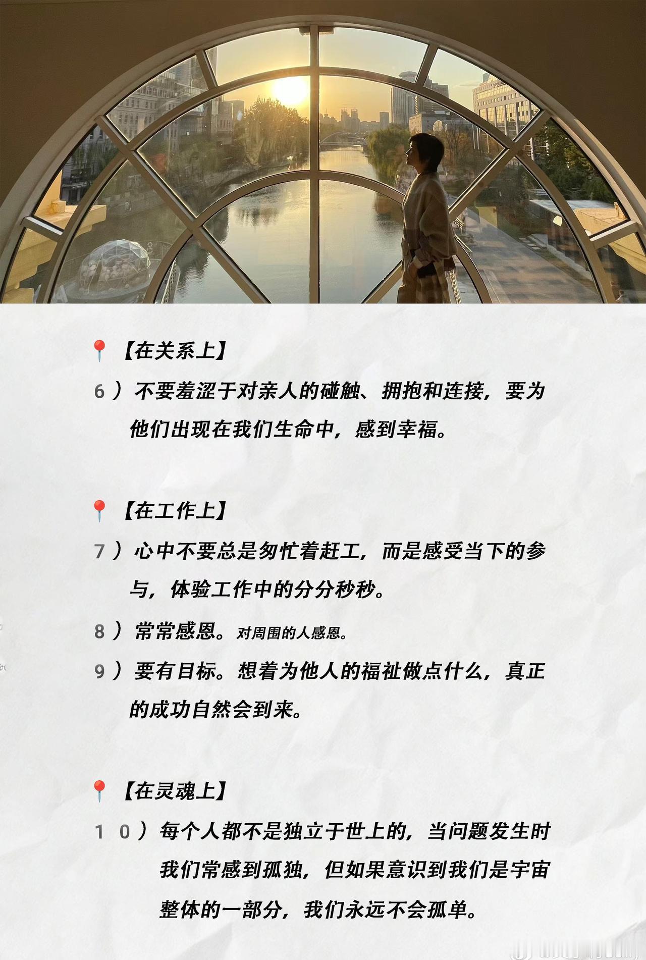 🏮新年愿望🏮 和朋友一起践行10个好习惯 📍【在身体方面】 1)减慢呼吸。因为快速呼吸对神经系统的影响是在生存模式下的,让我们很容易产生焦虑紧张,不利于健康。 2)常微笑。因为微笑让人快乐,健康充满活力。 3)每天步行一小时运动,让身体充满活力。 📍【在头脑方面】 4)要意识到所有的问题和挑战都会过去。不要和他争斗,因为头脑像块沙,会把人带入头脑的漩涡中。 5)觉知我们的情绪。当下的情绪是愤怒、恐惧还是悲伤,看到它就能够停下来,不要和它斗争,斗爭只会被它往下拉。 📍【在关系上】 6)不要羞涩于对亲人的碰触、拥抱和连接,要为他们出现在我们生命中,感到幸福。 📍【在工作上】 7)心中不要总是匆忙着赶工,而是感受当下的参与,体验工作中的分分秒秒。 8)常常感恩。对周围的人感恩。 9)要有目标。想着为他人的福祉做点什么,真正的成功自然会到来。 📍【在灵魂上】 10)每个人都不是独立于世上的,当问题发生时我们常感到孤独,但如果意识到我们是宇宙整体的一部分,我们永远不会孤单。 过年,像是跨过了一个时空交界点,拥有了全新的一年,这时我们总会对自己许下新愿望。 马年邀请小伙伴为自己许下心愿,践行10个新习惯,我先写下我的。小伙伴们想践行的习惯是什么呢? 新的一年让我们一起努力📍