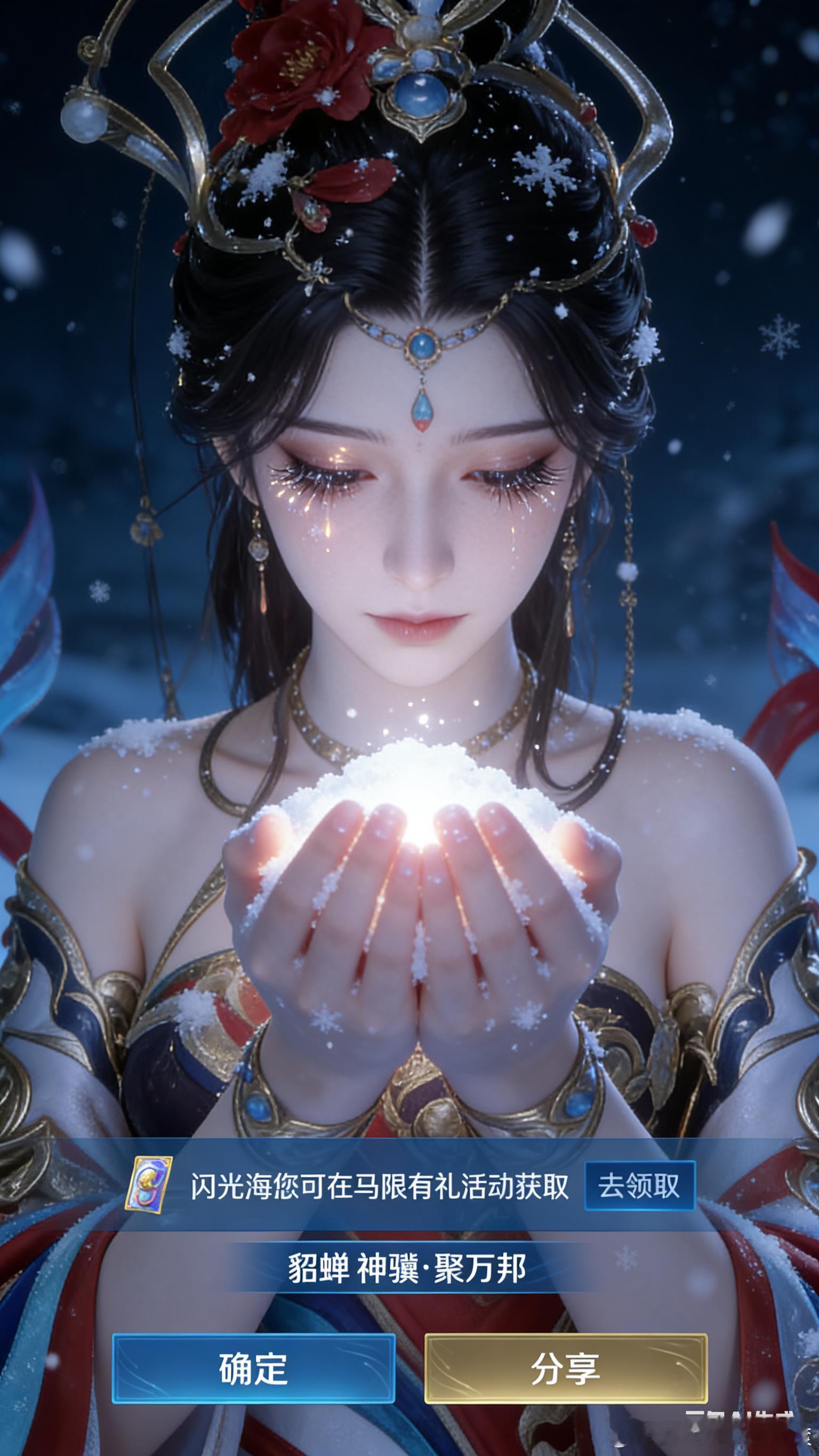 王者荣耀英雄拜年王者荣耀英雄拜年AI游我马上游福春节二创视频大赛王者荣耀 小红薯大神的ai的指令就是很棒:图片中的游戏人物生成正面的低下头看手里雪的面部特写,突出双手合掌时手心里的雪有光亮,并且光折射在脸上的忧郁状态,手心里是捧着雪,并添加下雪天氛围,着重让眼睫毛雪花多一些和手上有落雪效果,背景是黑夜下雪,游戏人物冷白皮,比例9:16。