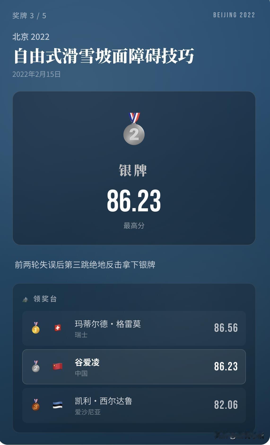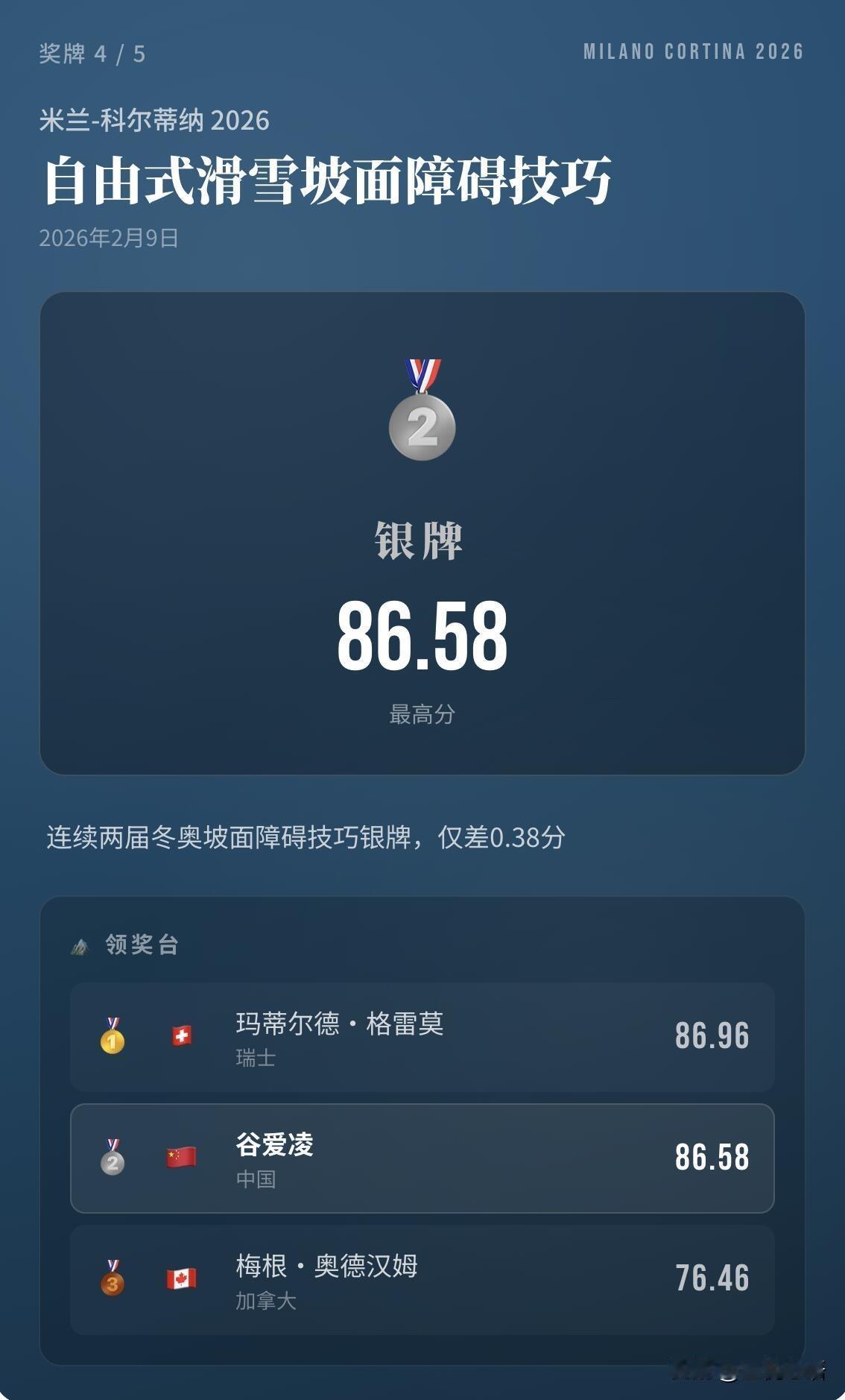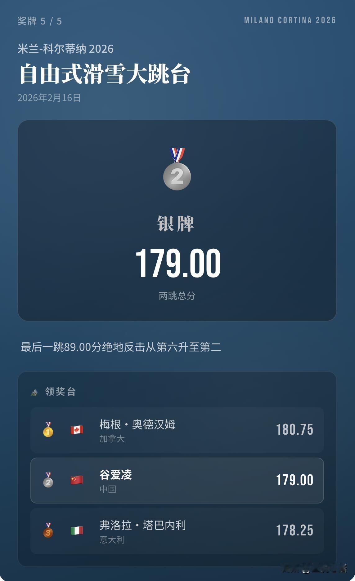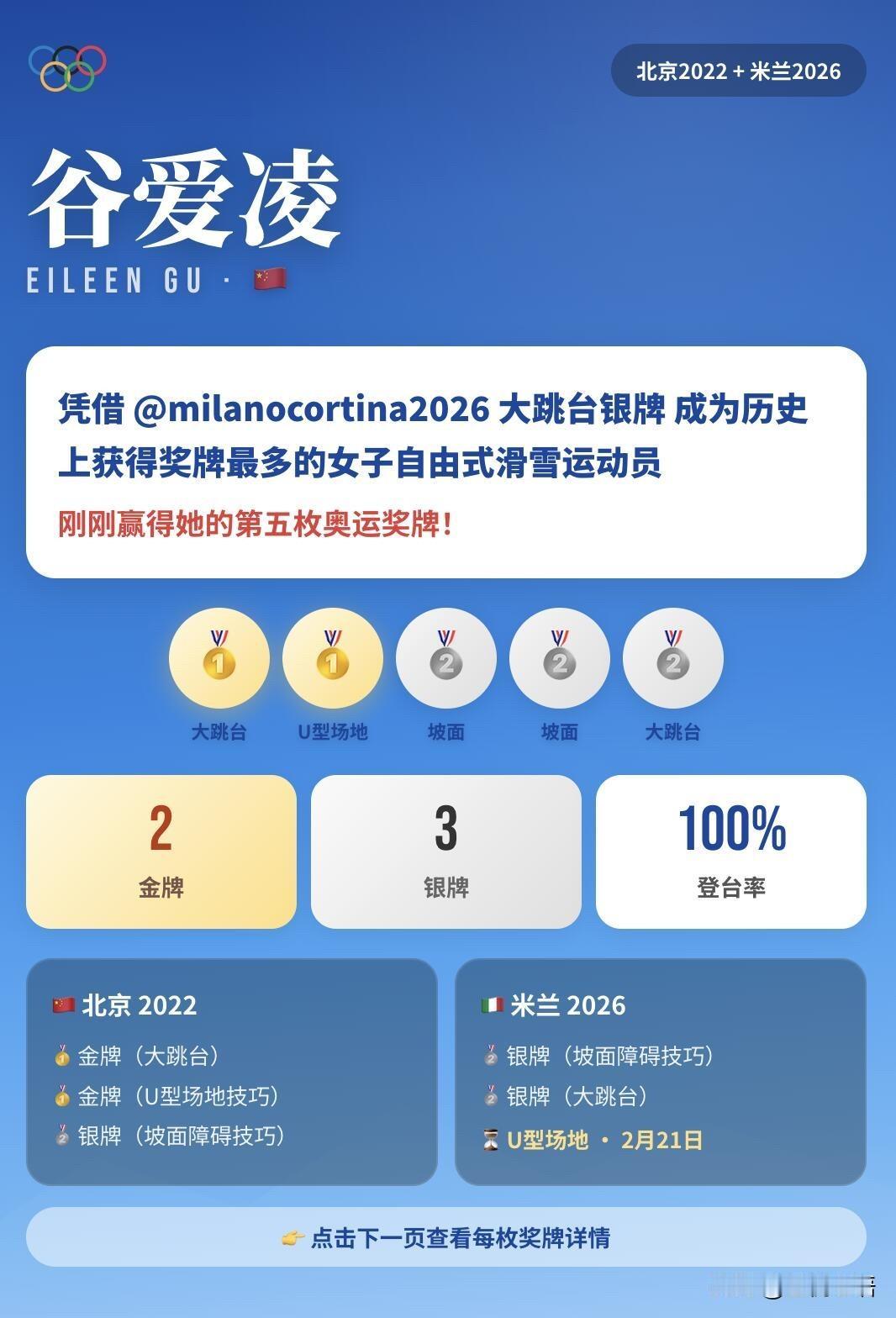 谷爱凌太牛了! 五枚冬奥奖牌在手, 直接封神女子自由式滑雪! 两届冬奥100%登台率, 2金3银的成绩,真的无人能敌。 米兰冬奥这两枚银牌太有分量, 坡面障碍惜败0.38分, 大跳台从第六绝地反超到第二, 次次逆风翻盘,这心理素质绝了! 谁说没卫冕金牌就是失败? 谁说第二就不能被记住? 能连续站上奥运赛场, 一次次战胜压力, 击败全世界的选手,本身就是王者。 谷爱凌从来不是只赢金牌, 她赢的是每一次的自己, 是把不可能变成可能的勇气, 这才是真正的体育精神! 永远为谷爱凌的拼搏和热爱❤️感动! 谷爱凌