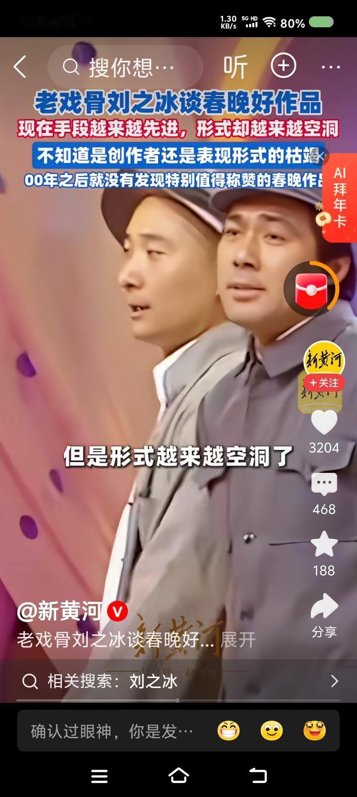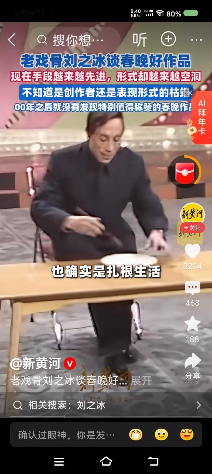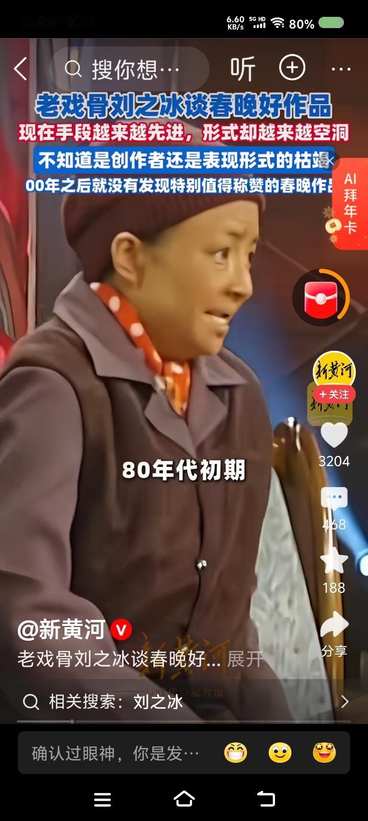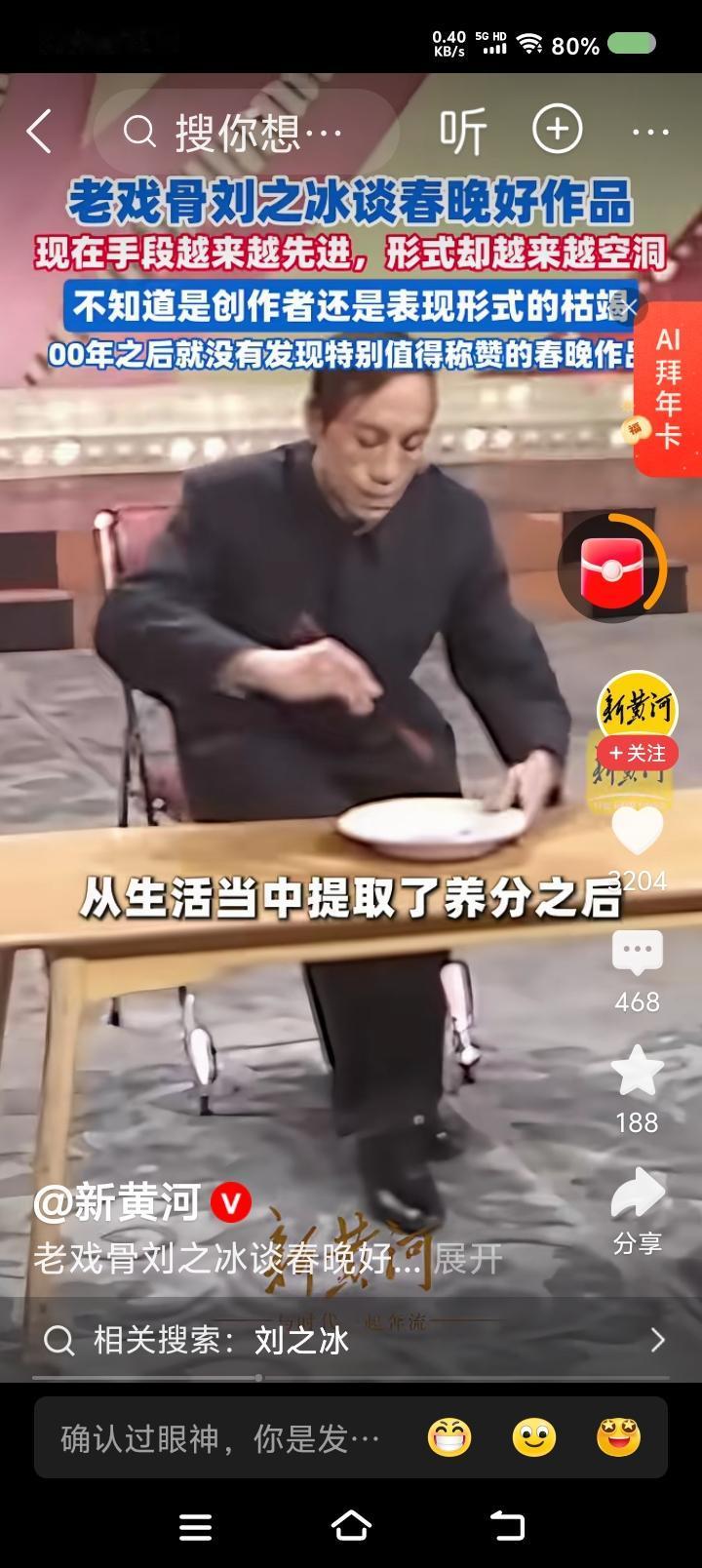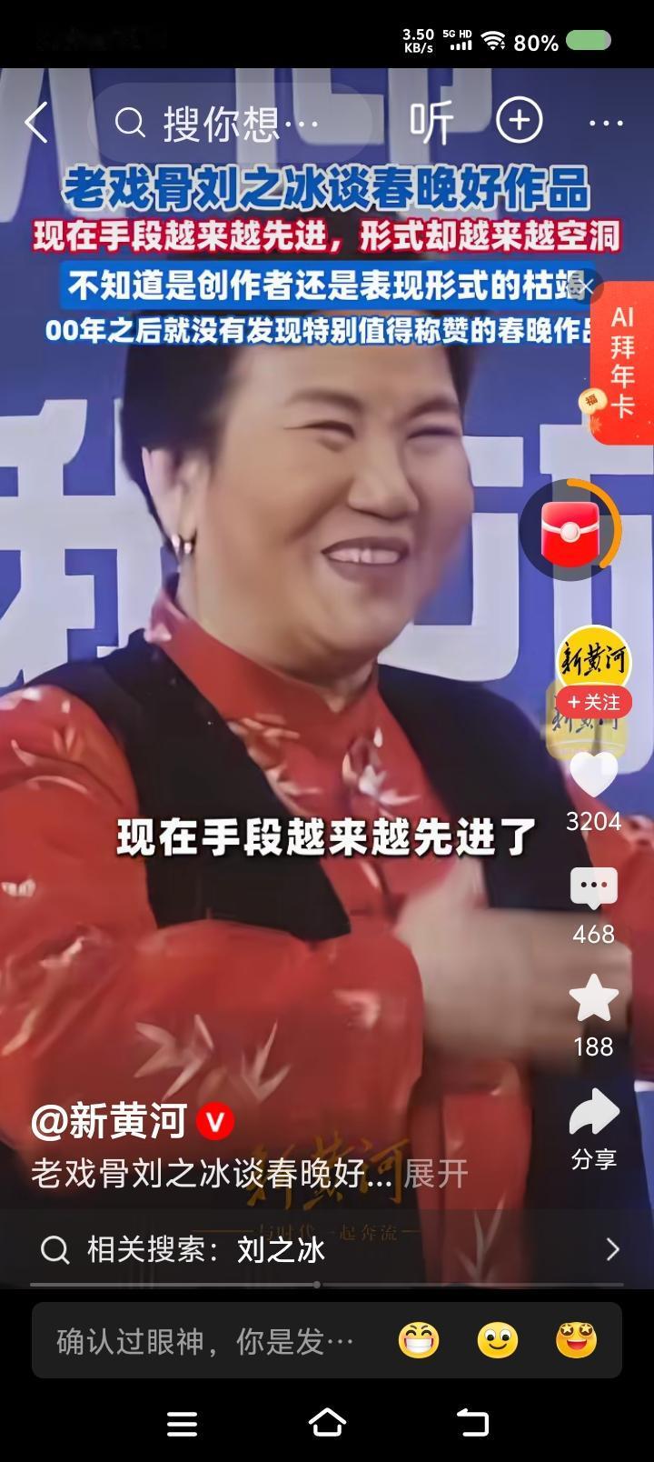 刘之冰说春晚—— 据报道,演员刘之冰评价春晚:“2000年之后,我就没发现特别值得称赞的作品。80年代初那批创作者,确实扎根生活,百炼成钢出作品。现在,手段越来越先进,形式(内容)越来越空洞。是创作者的枯竭,还是形式的枯竭?文艺失去了批判,就不那么健康。春晚失去了应有的魅力。” 点评: 春晚和中国男足一样,年年办,年年企图创新,年年遭批评,年年还要办。 应该说,春晚代表中国演艺的最高水平,人们对它的批评,代表对文艺创作者的不满。 怎么办? 首先解决由谁办的问题。央视春晚,可以由央视以外的群众团体办,不能光听专家的意见。