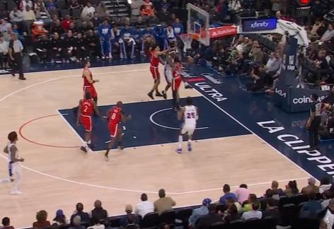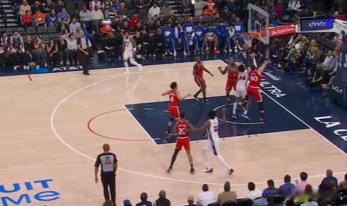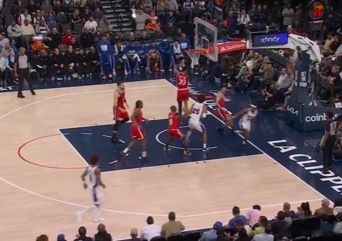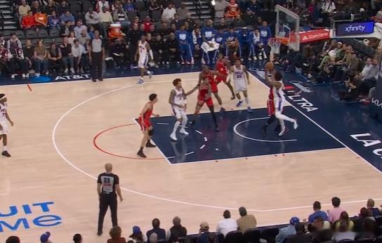 12恩比德篮下终结不中,巴洛抓快船防守沟通、篮板卡位同时轻松切入篮下后高高跃起双手将球砸进篮筐。