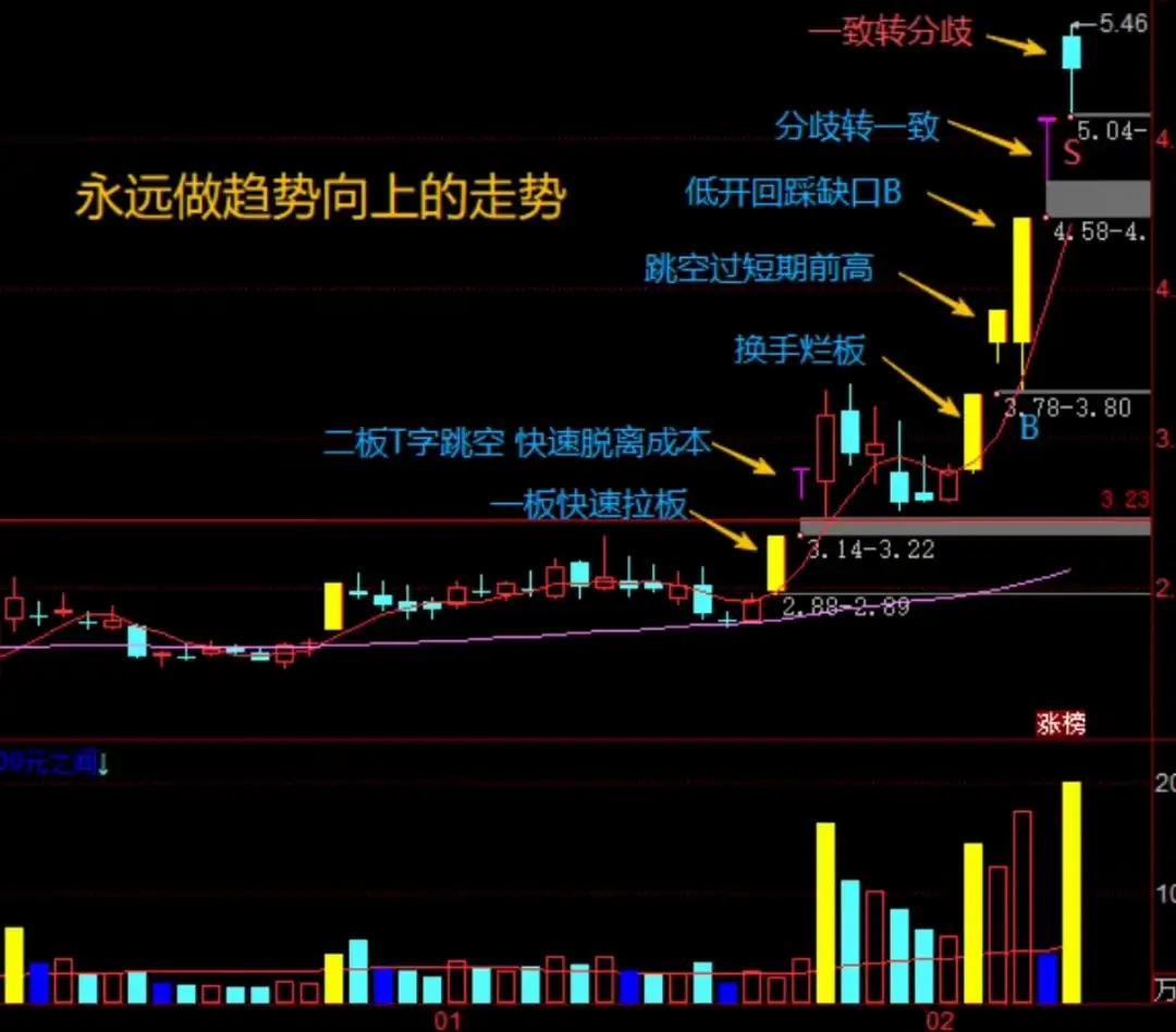 寻龙诀:抓龙头起爆点五步法 想在A股抓龙头主升浪?核心是看懂“趋势向上、台阶向上”。 1. 首板:快速拉板突破横盘,温和放量定趋势,仅标记观察。 2. 二板:关键确认点。若出现“T字跳空”秒封板,主力意在长远。 3. 分歧转一致:中途必有换手烂板清洗浮筹,烂板后再度强势封板是最佳买点。 4. 加速阶段:跳空突破前高留缺口,随后低开回踩不破缺口即上车信号。 5. 高位离场:高位出现“一致转分歧”(冲高回落、巨量),主力出货,果断止盈。 核心: 短线重在跟随趋势与资金,而非预测。