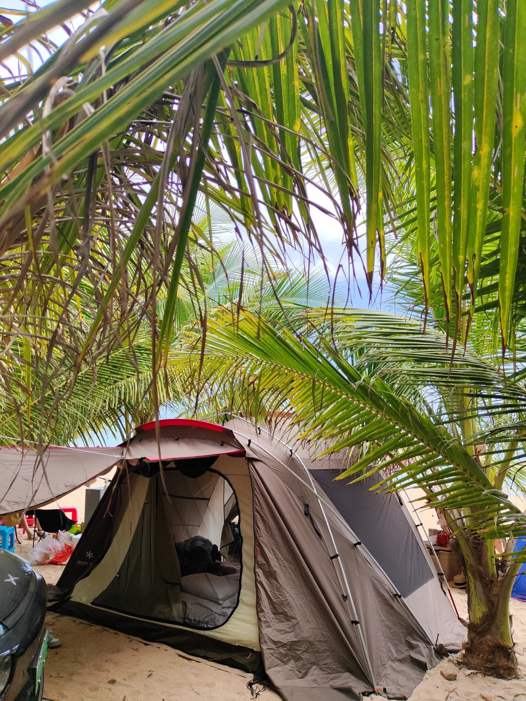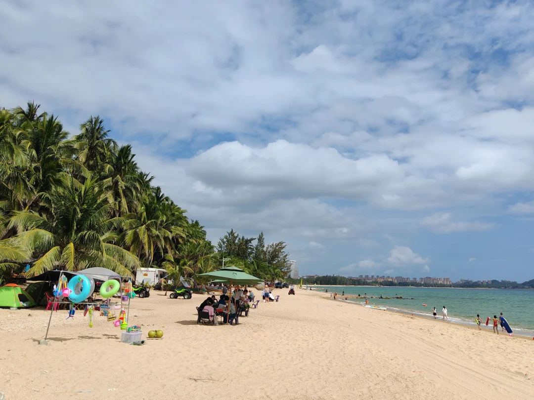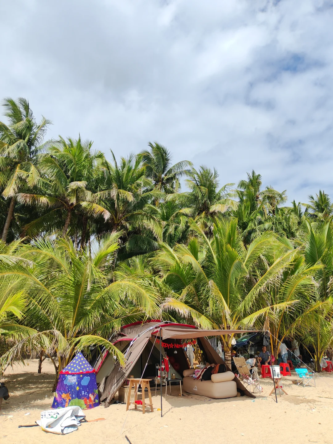 2026年大年初一 发现了一个可以露营的海边营地 椰子树下可以遮阳搭帐篷 有水有电有卫生间 沙滩走几步就到海里了 太阳照射下来海水透出了几个颜色 有点拥挤 提前约可能好些
