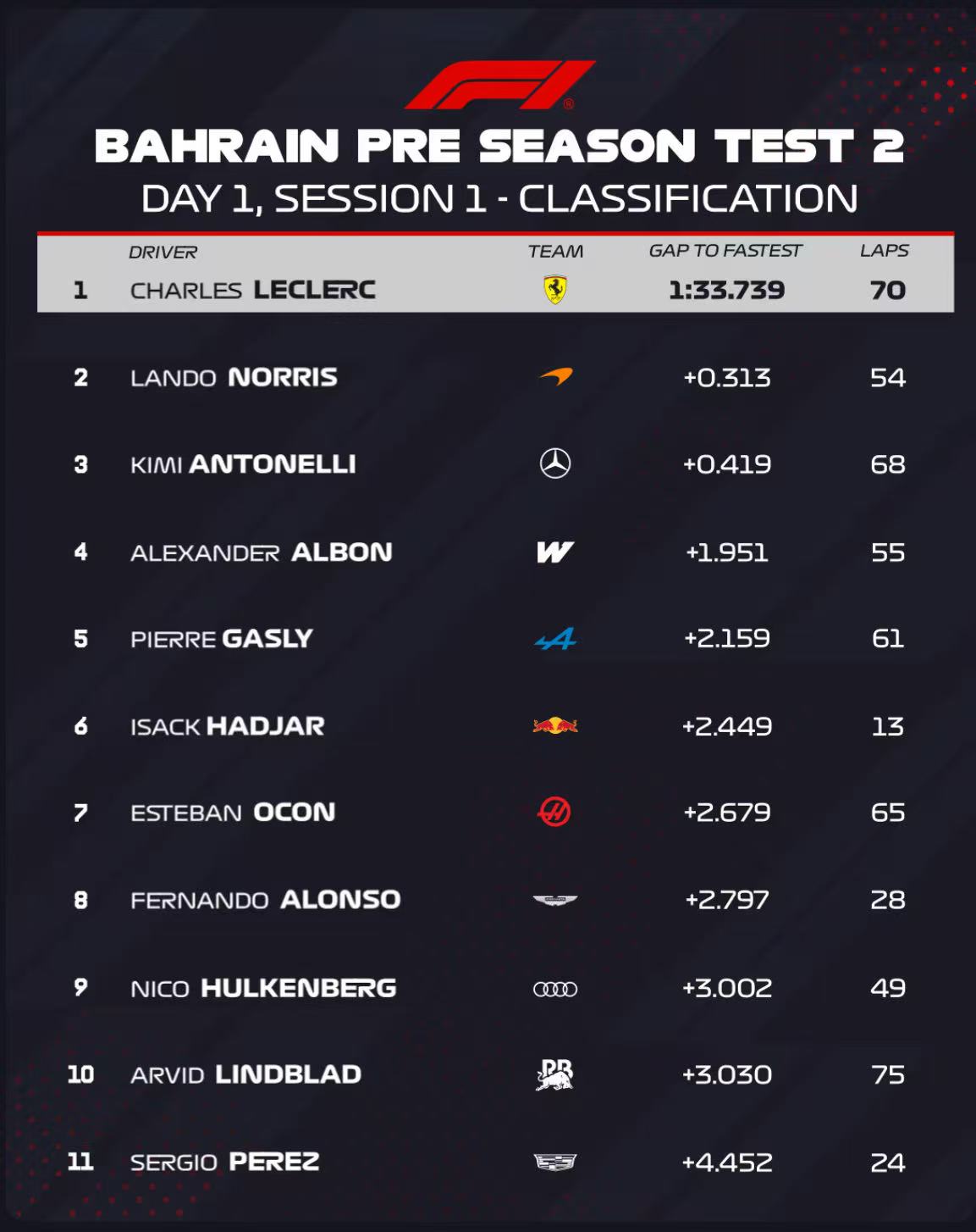 在巴林举行的季前测试第二周的首个上午,勒克莱尔领跑