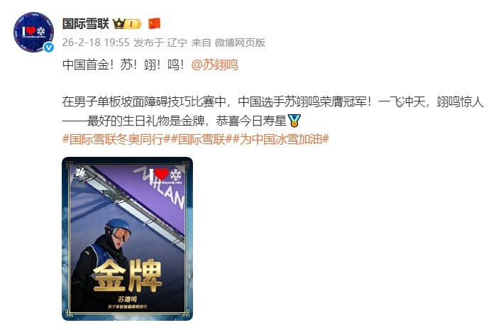 直播吧2月18日讯米兰冬奥会单板滑雪男子坡面障碍技巧决赛,今天迎来22岁生日的中国选手苏翊鸣以82.41分夺得金牌。赛后,国际雪联也发文恭喜苏翊鸣夺得冠军。