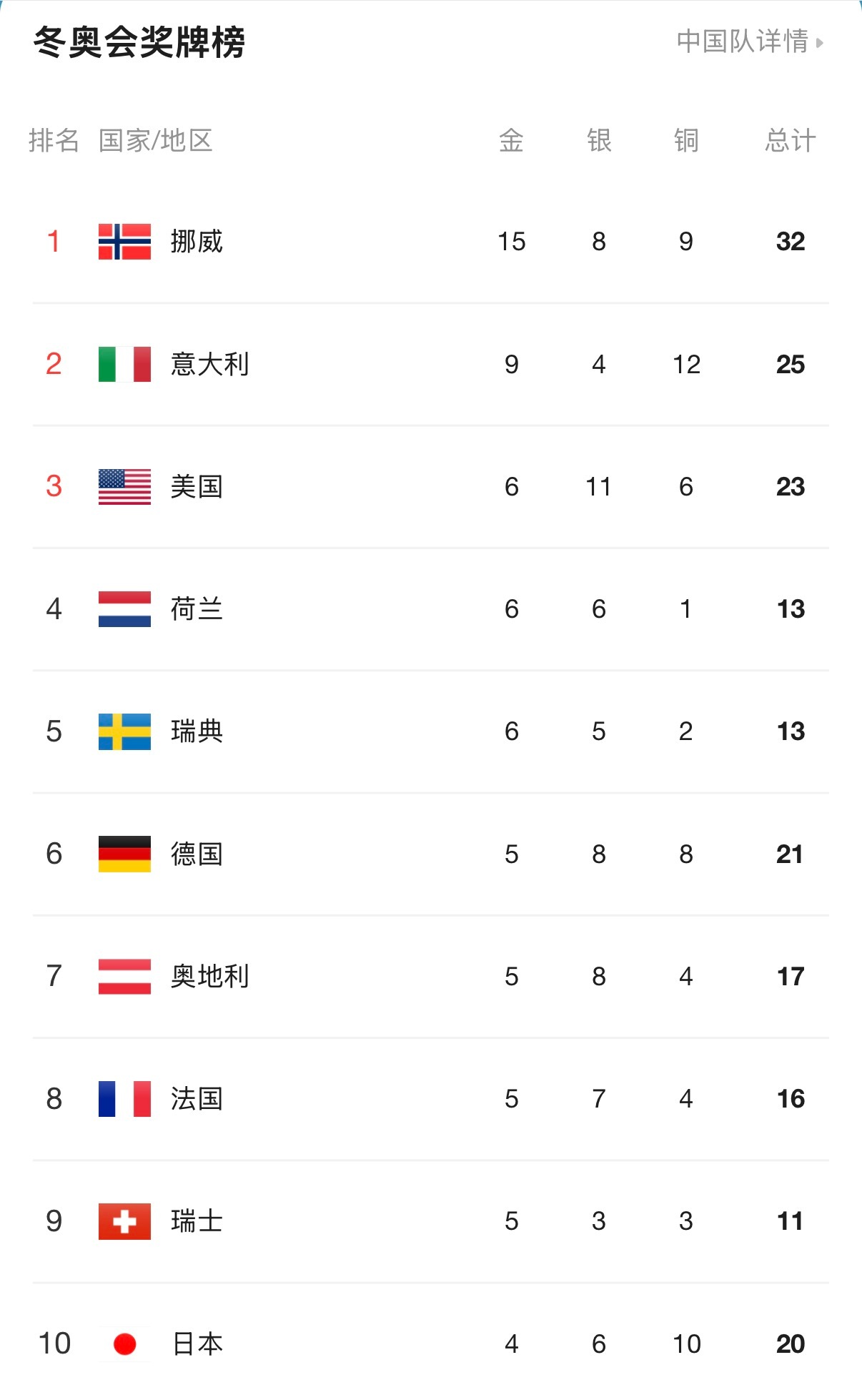 冬奥会奖牌榜 中国队凭借一晚两金,升至冬奥奖牌榜第14位