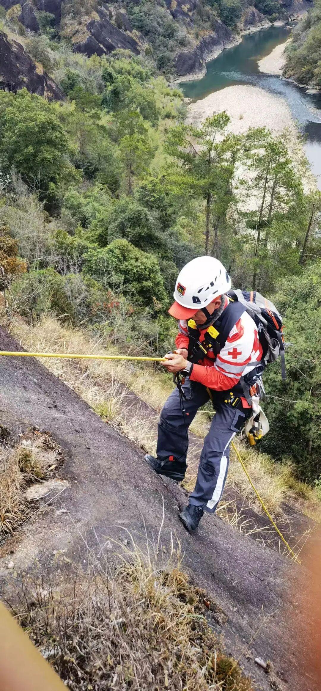 一小时后,武夷山市红十字会救援队队员李振旺、金恒旺、王九生从30多公里外的驻地赶到现场。经勘查,背包卡在距游步道约30米深的崖壁灌木丛中,周边地势险峻。