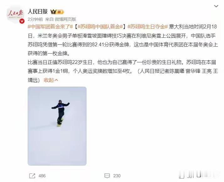 热烈祝贺中国冬奥代表团获得首金! 在今天下午18点20分开始的米兰冬奥会单板滑雪男子坡面障碍技巧决赛中,今天刚好22岁生日的中国名将苏翊鸣,以82.41分获得金牌,这也是中国冬奥体育代表团的第一枚金牌!