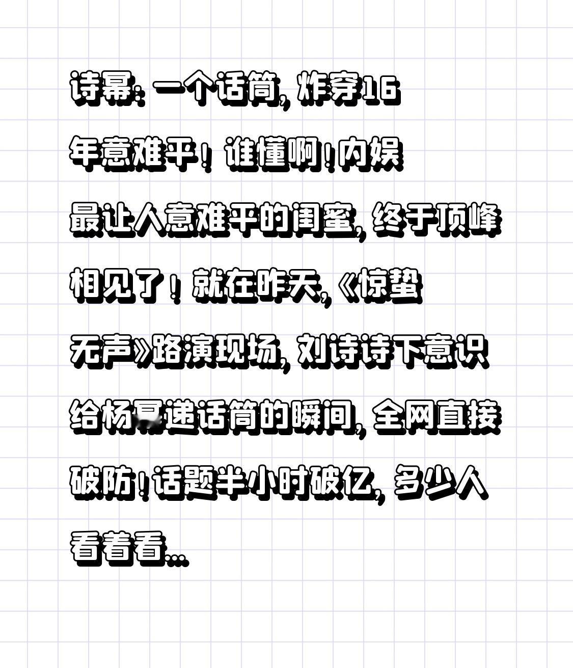诗幂:一个话筒,炸穿16年意难平! 谁懂啊!内娱最让人意难平的闺蜜,终于顶峰相见了! 就在昨天,《惊蛰无声》路演现场,刘诗诗下意识给杨幂递话筒的瞬间,全网直接破防!话题半小时破亿,多少人看着看着就哭了——这哪里是营业,这是刻在骨子里的默契啊! 还记得2009年的《仙剑三》吗? 娇俏灵动的雪见,温柔隐忍的龙葵,戏里是相依为命的兄妹,戏外是同吃同住、无话不谈的小姐妹。 杨幂喊她“妹妹”,刘诗诗叫她“小幂”,一起跑通告、拍杂志、逛大街,那是她们最干净、最耀眼的青春,也是一代人的白月光。 可后来呢? 同样是顶流85花,同样的戏路、同样的资源,舆论逼她们成“对手”,粉丝吵得不可开交,坊间全是“闹掰”“不和”的传言。 同框变少、互动消失,曾经亲密无间的两个人,慢慢活成了彼此朋友圈里的“陌生人”。 多少人遗憾:名利场里,真的没有长久的友情吗? 这一沉默,就是16年。 我们以为她们会一直陌生,以为童年滤镜终究会碎。 直到这次同框,刘诗诗自然递出话筒,杨幂坦然接过,相视一笑,没有尴尬、没有刻意,所有流言不攻自破。 原来,走散过,从未走远;不常联系,从未忘记。 她们没有在流量里消耗彼此,而是各自沉淀、各自成长,用最体面的方式,在更高处重逢。 这才是成年人最好的友情:不捆绑、不内耗,你顶峰绽放,我默默祝福,再相遇时,依旧是当年的模样。 其实我们追的从来不是CP,是自己回不去的青春,是相信真心不会被时光辜负。 16年风雨,她们用一个动作告诉所有人: 女生之间的情谊,从来不是只有竞争,更有惺惺相惜、彼此成全。 诗幂未完待续,愿我们都能拥有,历经岁月依然滚烫的真心。 你当年磕过诗幂吗?哪一幕最让你难忘?评论区告诉我!