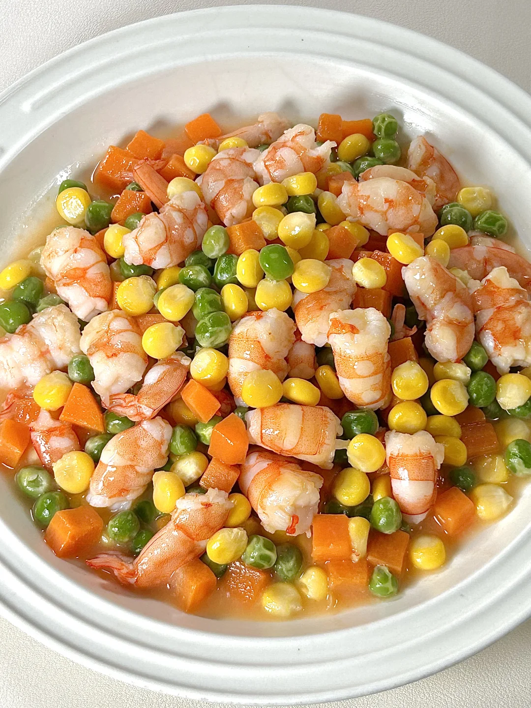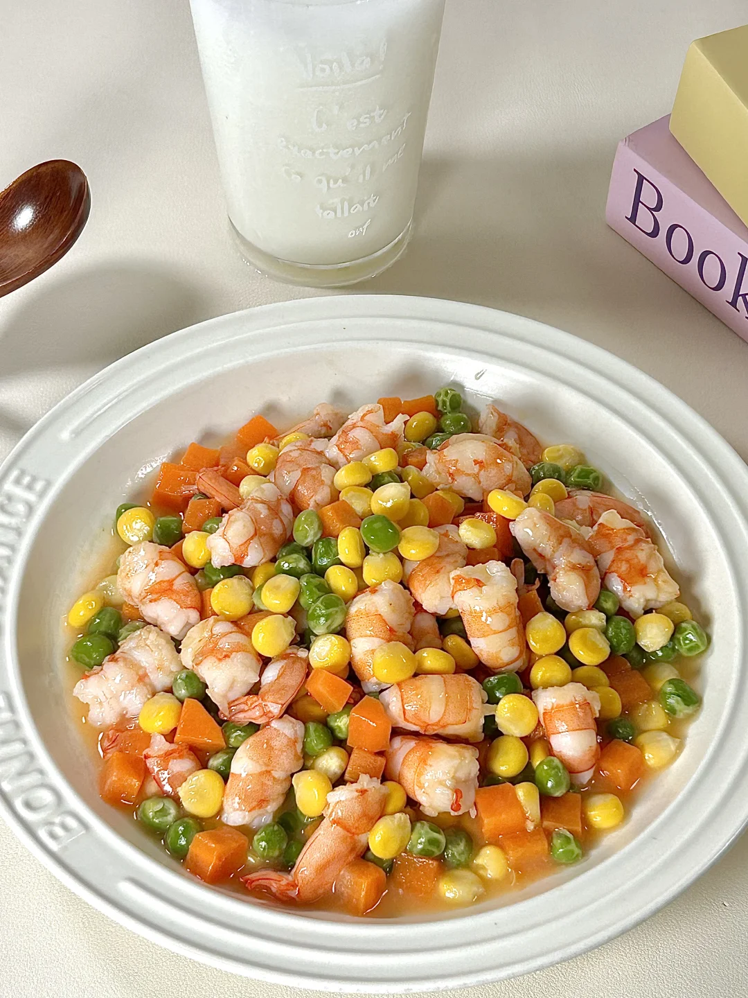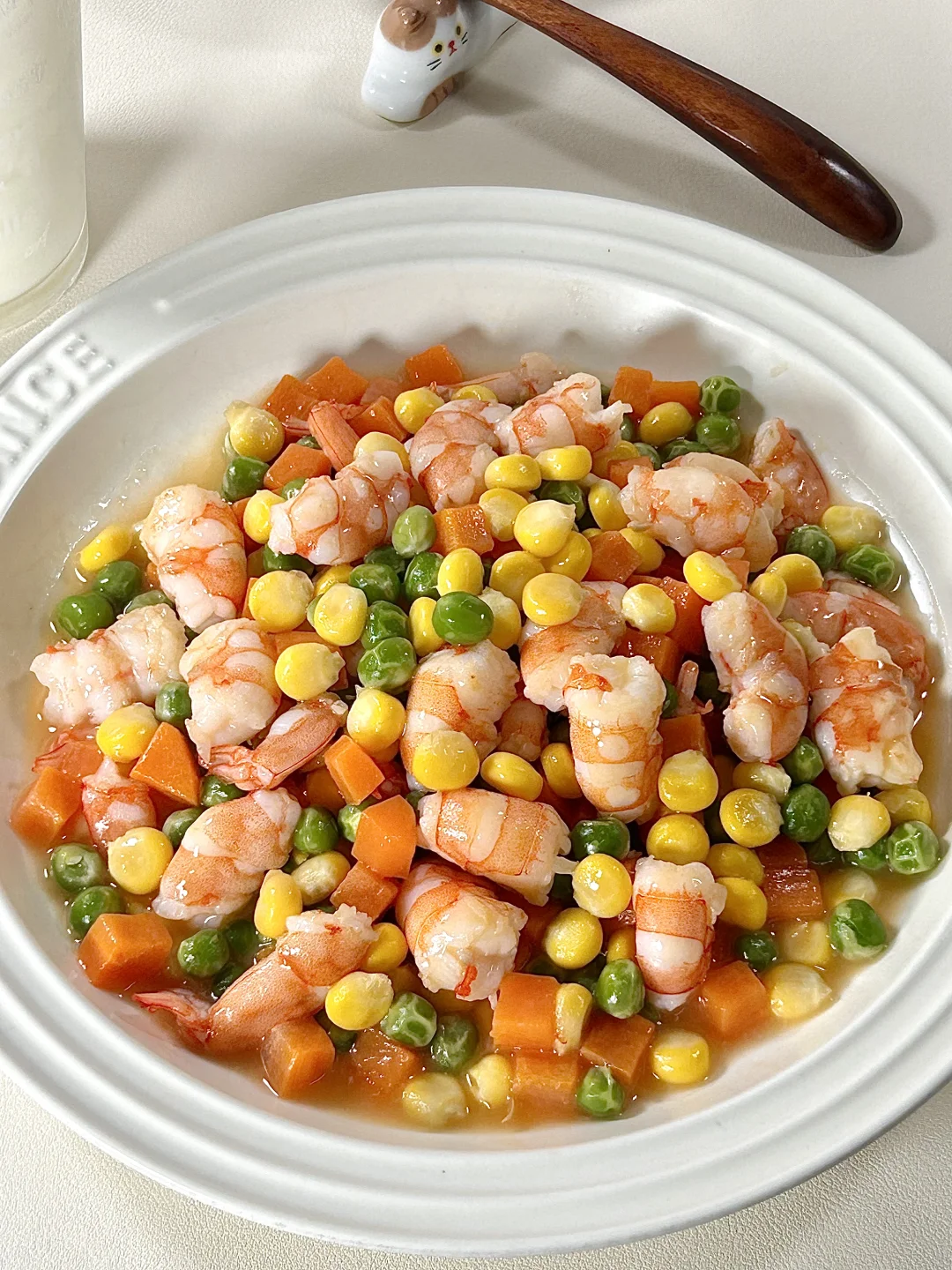 低脂低卡 金玉满堂 年夜饭的餐桌上少了这道金玉满堂,口感鲜甜,营养丰富,好看又好吃😋 📝食材: 玉米粒+荷兰豆+虾仁+胡萝卜 🫕做法: 水开放入果蔬焯水2分钟→起锅把虾仁炒熟→倒入果蔬→加鸡精盐调味 最后淋上淀粉水勾芡即可出锅啦~