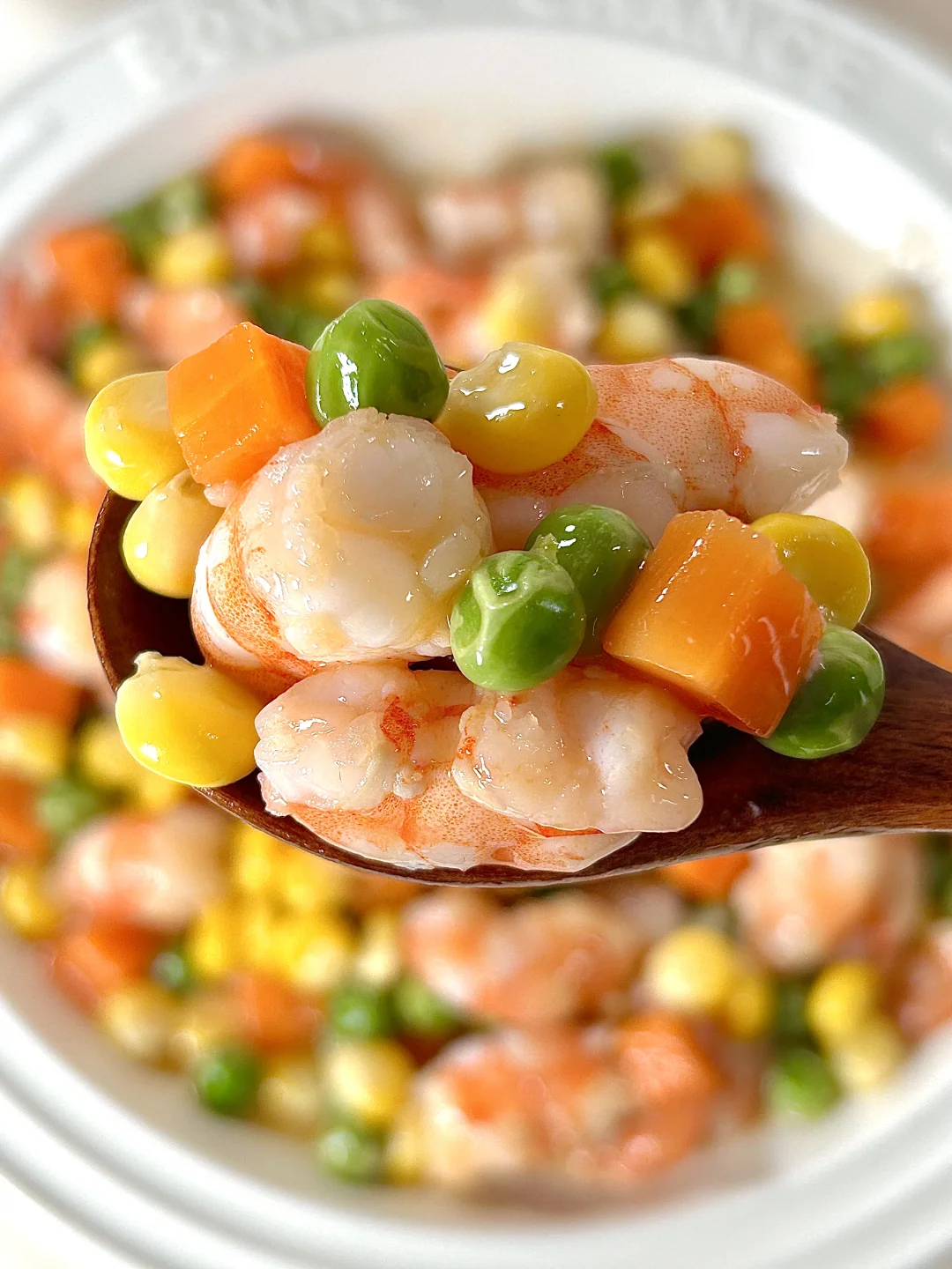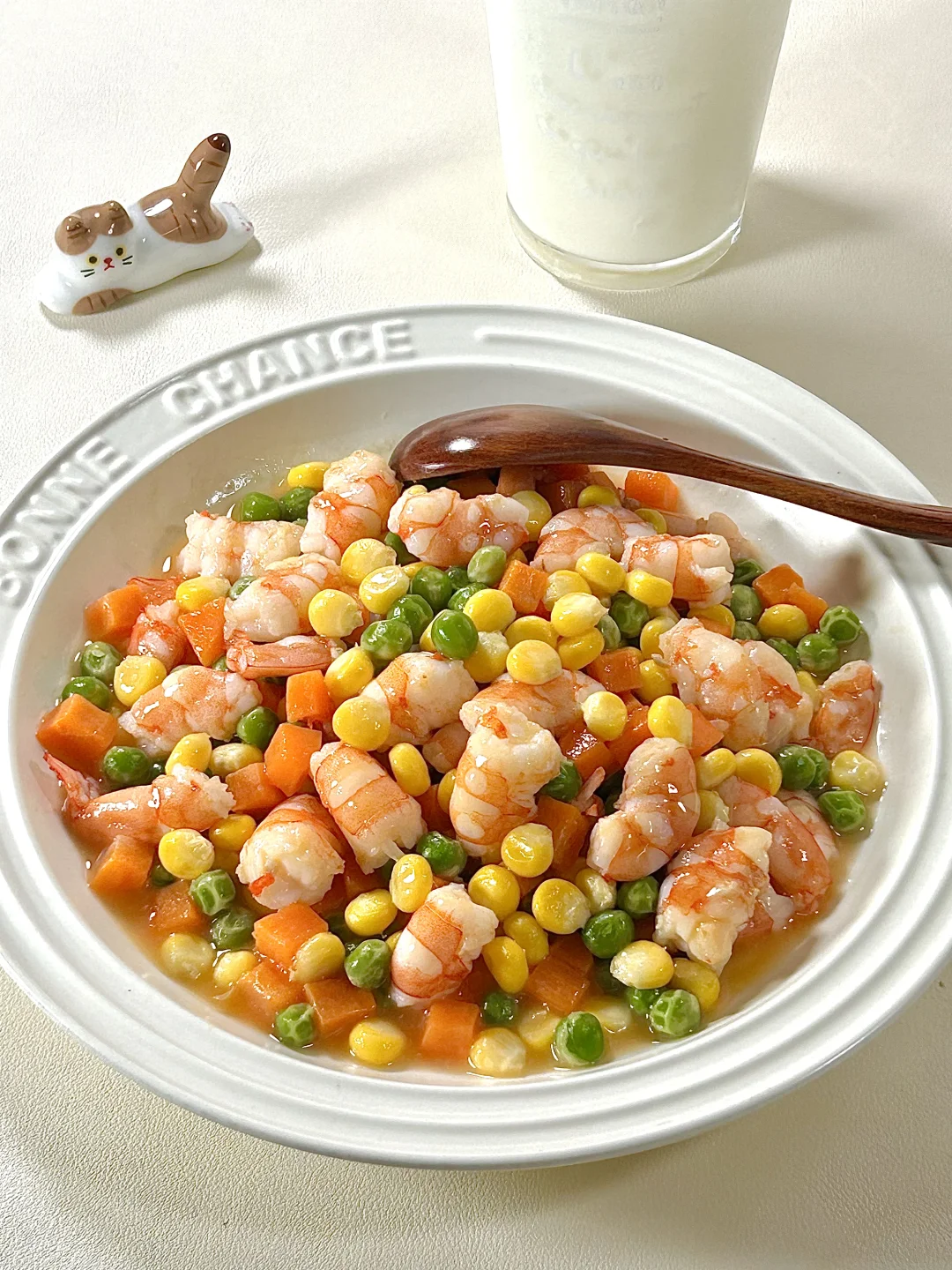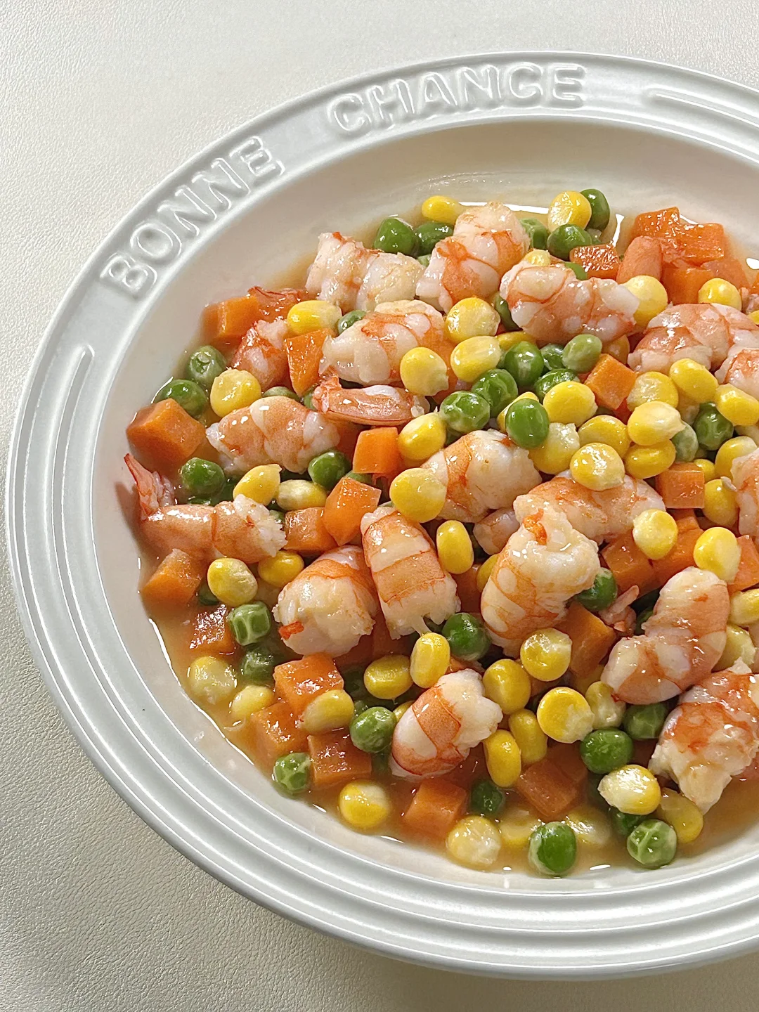 低脂低卡 金玉满堂 年夜饭的餐桌上少了这道金玉满堂,口感鲜甜,营养丰富,好看又好吃😋 📝食材: 玉米粒+荷兰豆+虾仁+胡萝卜 🫕做法: 水开放入果蔬焯水2分钟→起锅把虾仁炒熟→倒入果蔬→加鸡精盐调味 最后淋上淀粉水勾芡即可出锅啦~