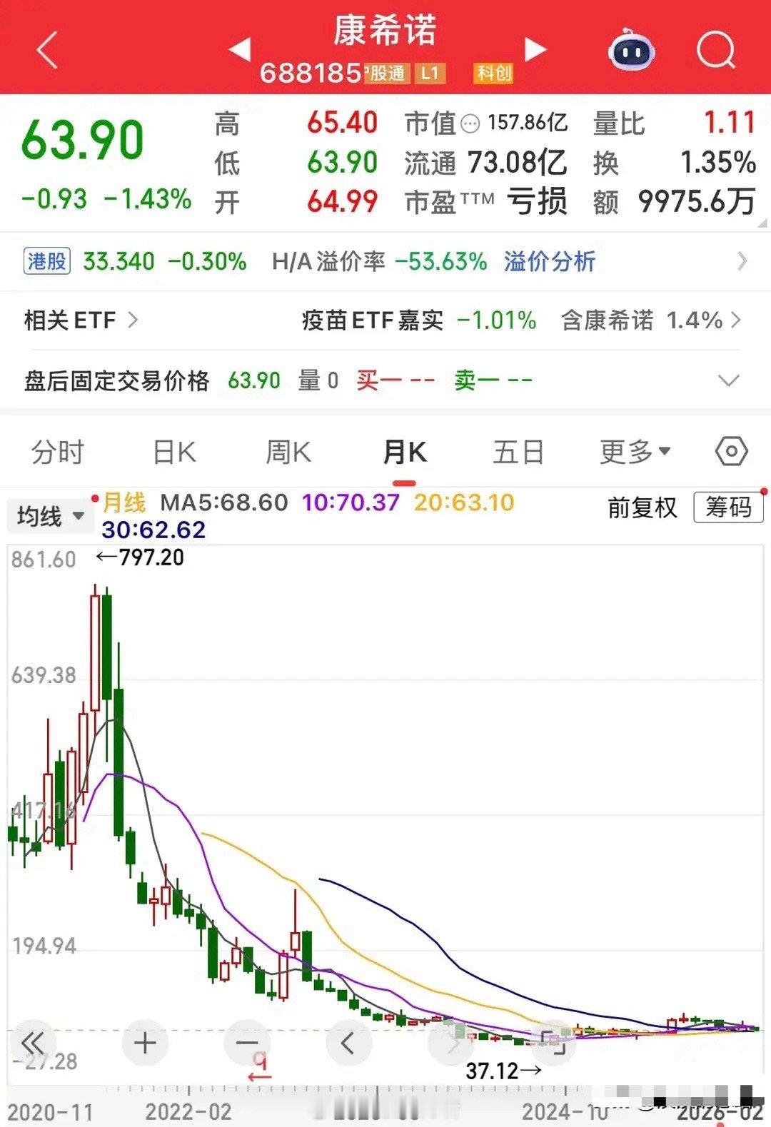 康希诺是这10只股票中跌幅最惨烈的。2020年8月以209.71元登陆科创板,主营生物制品,股价曾飙至797.20元,如今仅报63.90元,且是唯一未进行转赠股的公司,较高点下跌93%,上市以来破发69.15%,公司净利润已连续三年亏损。