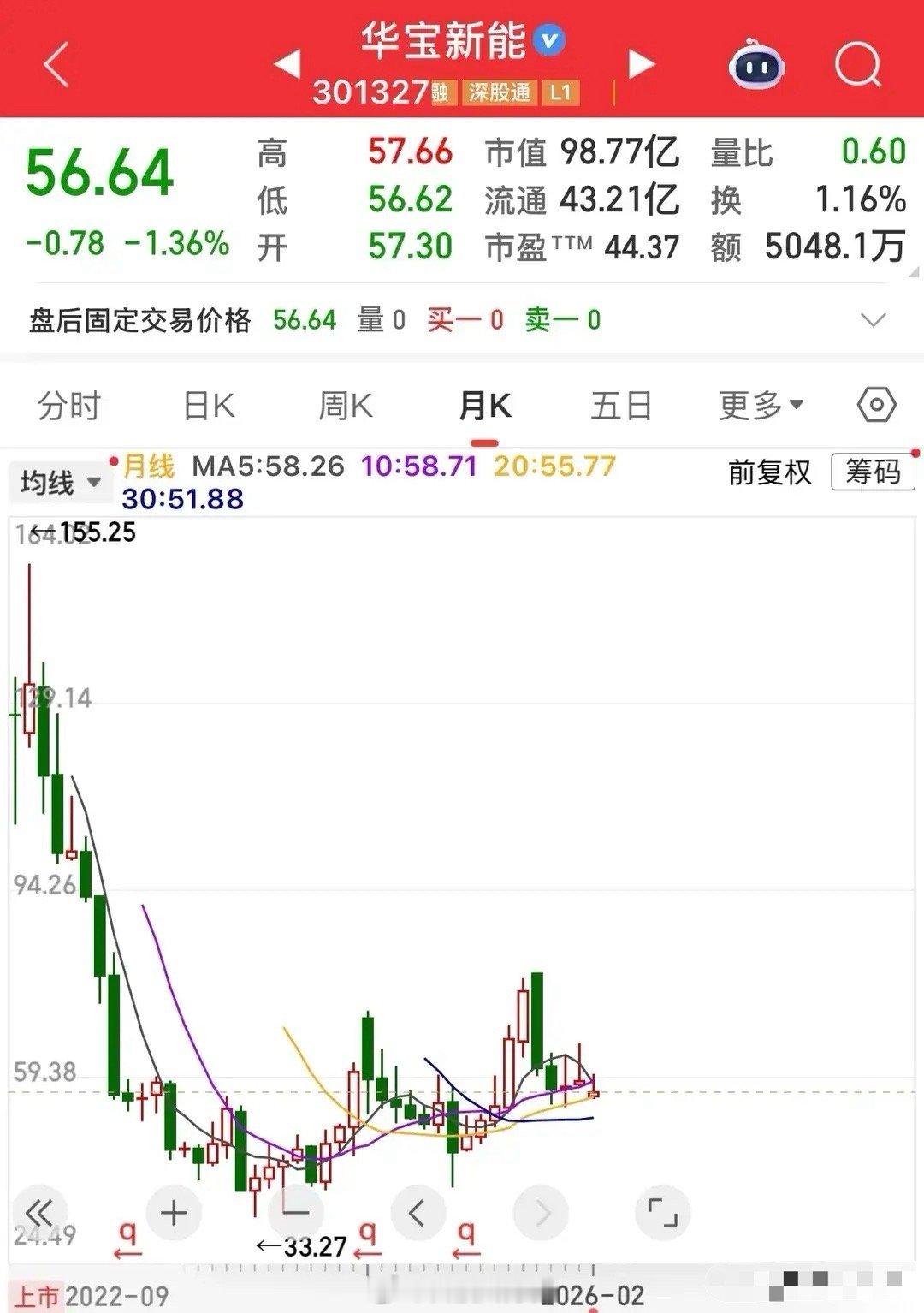 创业板的华宝新能2022年9月以237.50元发行,主营电力设备,股价曾达286.5元,经三次转赠股后现报56.64元,期间下跌64%,最低跌至33元,上市以来破发54.93%,市盈率44.37倍。
