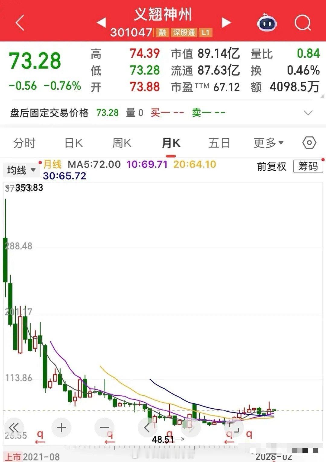 创业板的义翘神州,2021年8月以292.92元发行,曾摸到353.83元高点,如今股价只剩73.38元,最低跌至55.03元,较高点下跌80%,上市以来破发42.22%。这家生物科技企业专注于重组蛋白生产,当前市盈率67.12倍。
