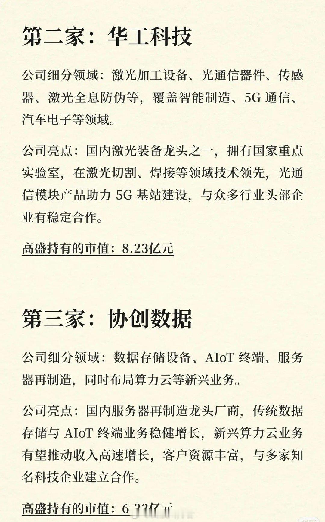 2. 华工科技:作为国内激光装备龙头,业务涵盖激光加工设备、光通信器件等,依托国家重点实验室的技术支撑,高盛持股市值8.23亿元。