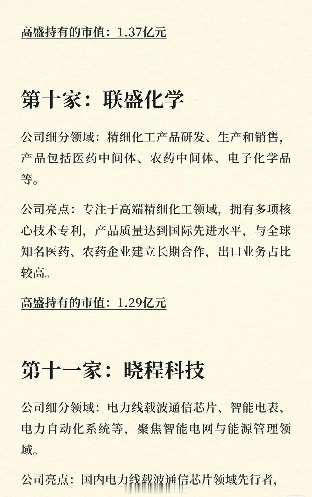 10. 联盛化学:深耕精细化工领域,聚焦医药、农药中间体等高端产品,高盛持股市值1.29亿元。