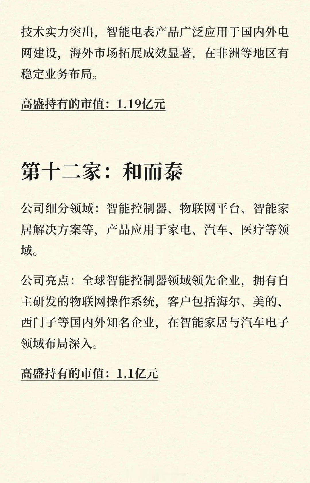 12. 和而泰:在智能控制器与物联网平台领域位居全球前列,高盛对其持股市值1.1亿元。