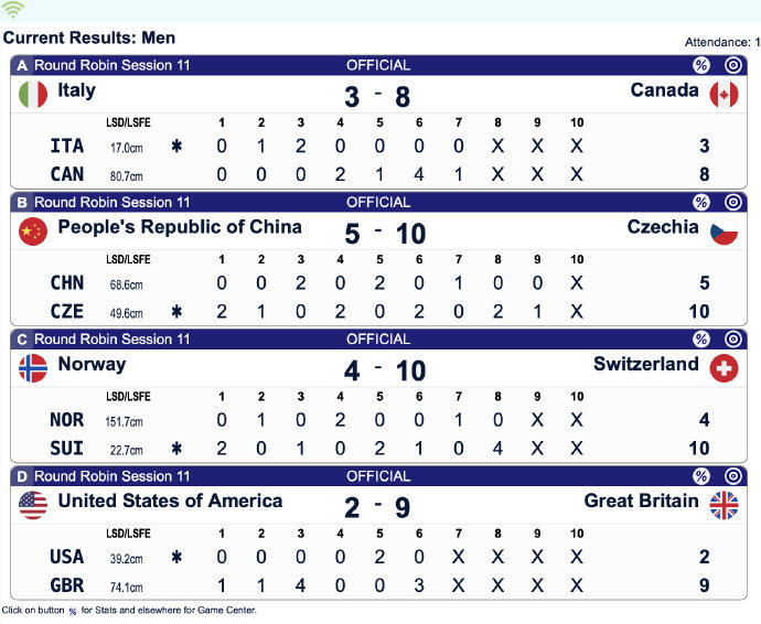 虎扑02月19日讯米兰冬奥会冰壶男子循环赛第11轮全部结束,比分情况如下: