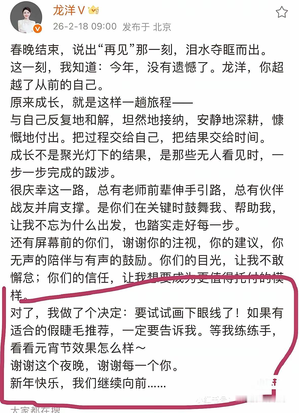 2026年马年春晚,龙洋“眼神上瞟”的细节被无限放大,甚至被扣上了“依赖提词器”的帽子。然而,真相却充满了戏剧性——今年的春晚主舞台为了实现“人在景中”的沉浸感,全程撤除了提词器。数万字的串词,全靠主持人烂熟于心,现场零失误输出。 所谓的“眼神飘忽”,不过是深眼窝的生理特征,遇上了只强调上眼线的舞台妆容,在高清镜头下产生的美丽误会。 最令人动容的,不是专业上的无可挑剔,而是她回应争议的姿态。没有官方套话的辩解,没有居高临下的疏离,她在长文里坦然落泪,那是五登春晚、全力以赴后的释然;更在文末俏皮地“认账”:决定试试画下眼线,还向全网征集假睫毛推荐,大方约定元宵节展示练习成果。 这一幕,狠狠打破了大众对“央视门面”的刻板印象。她不再是聚光灯下不食人间烟火的符号,而是会为了眼妆细节纠结、会像普通女孩一样寻求美妆建议的鲜活个体。 这场“眼线之约”,实则是一次最高级的公众沟通。它用幽默消解了对立,用坦诚拉近了距离。网友们纷纷化身“美妆顾问”,评论区从“评委席”变成了温暖的互动场。 龙洋曾说,成长是无人看见时一步一步的跋涉。从初登春晚的青涩忐忑,到如今从容扛鼎无提词器直播,她把所有质疑都化作了深耕的动力。而这次关于眼线的小插曲,更让我们看到了新生代主持人的底气——专业上硬气,态度上柔软。 不必苛责完美,真实才最动人。这个元宵节,我们不妨多盯一眼龙洋的眼妆,那不仅是她对观众的承诺,更是一个成熟的公众人物,与这个时代温柔相处的最好证明。