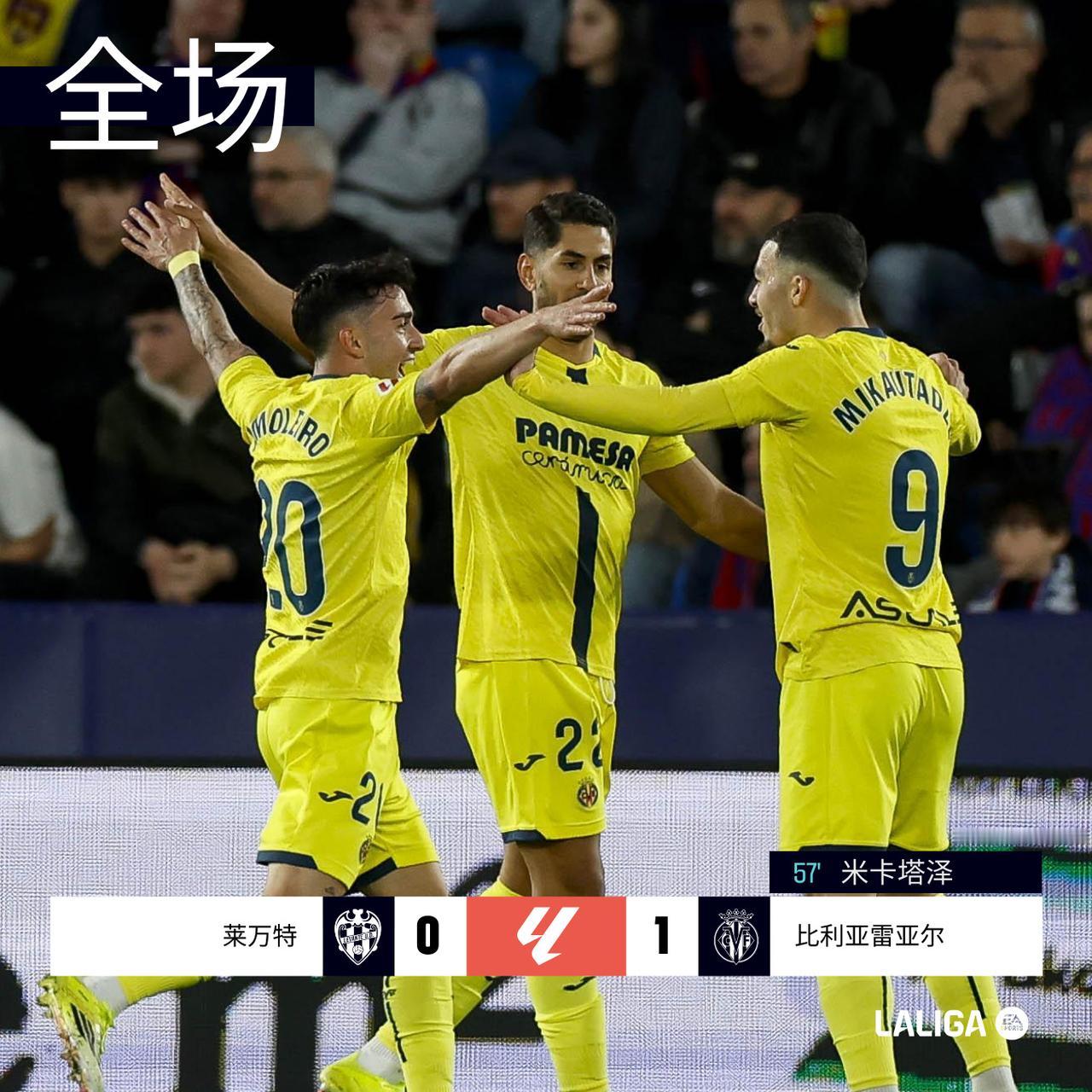 全场|莱万特0-1 比利亚雷亚尔 30' 莫莱罗头球击中门柱错失良机。 41' 阿约塞禁区内打门被扑。 49' 格耶远射稍偏。 ⚽️57' 佩佩将球分给左路的米卡塔泽,后者兜射破门,0-1。 86' 佩佩的打门稍稍高出。 黄色潜水艇客场小胜。