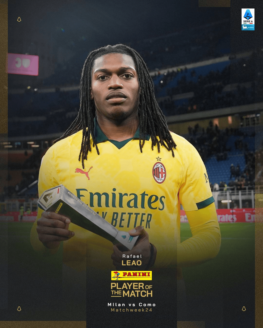 挑射破门,莱奥当选米兰vs科莫全场最佳球员