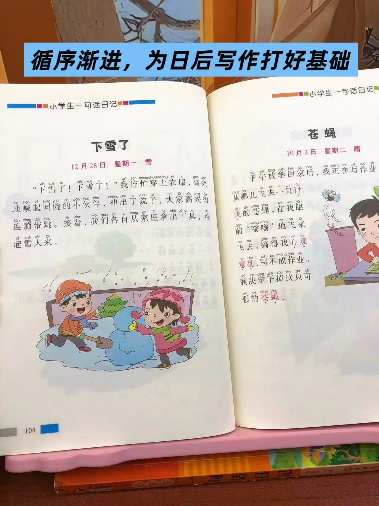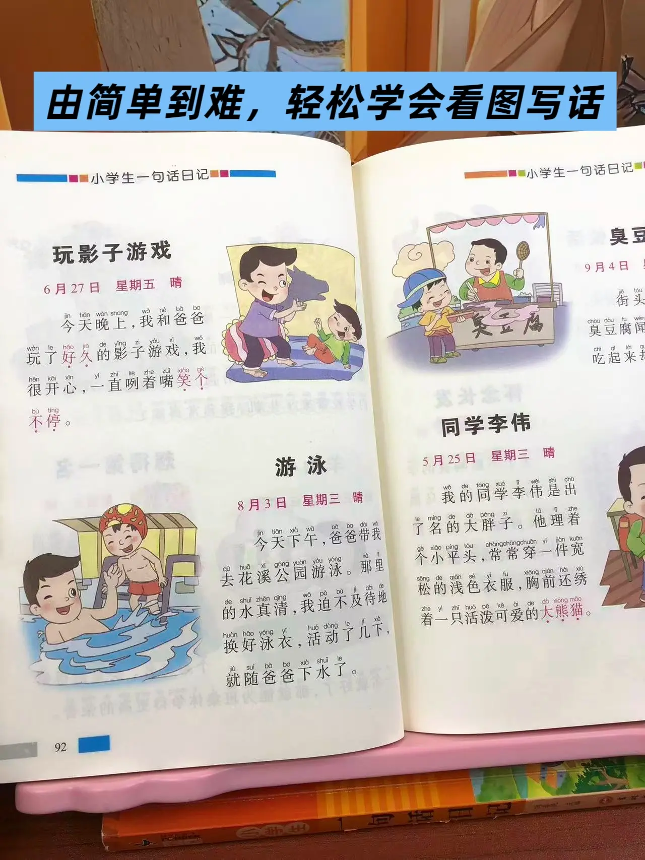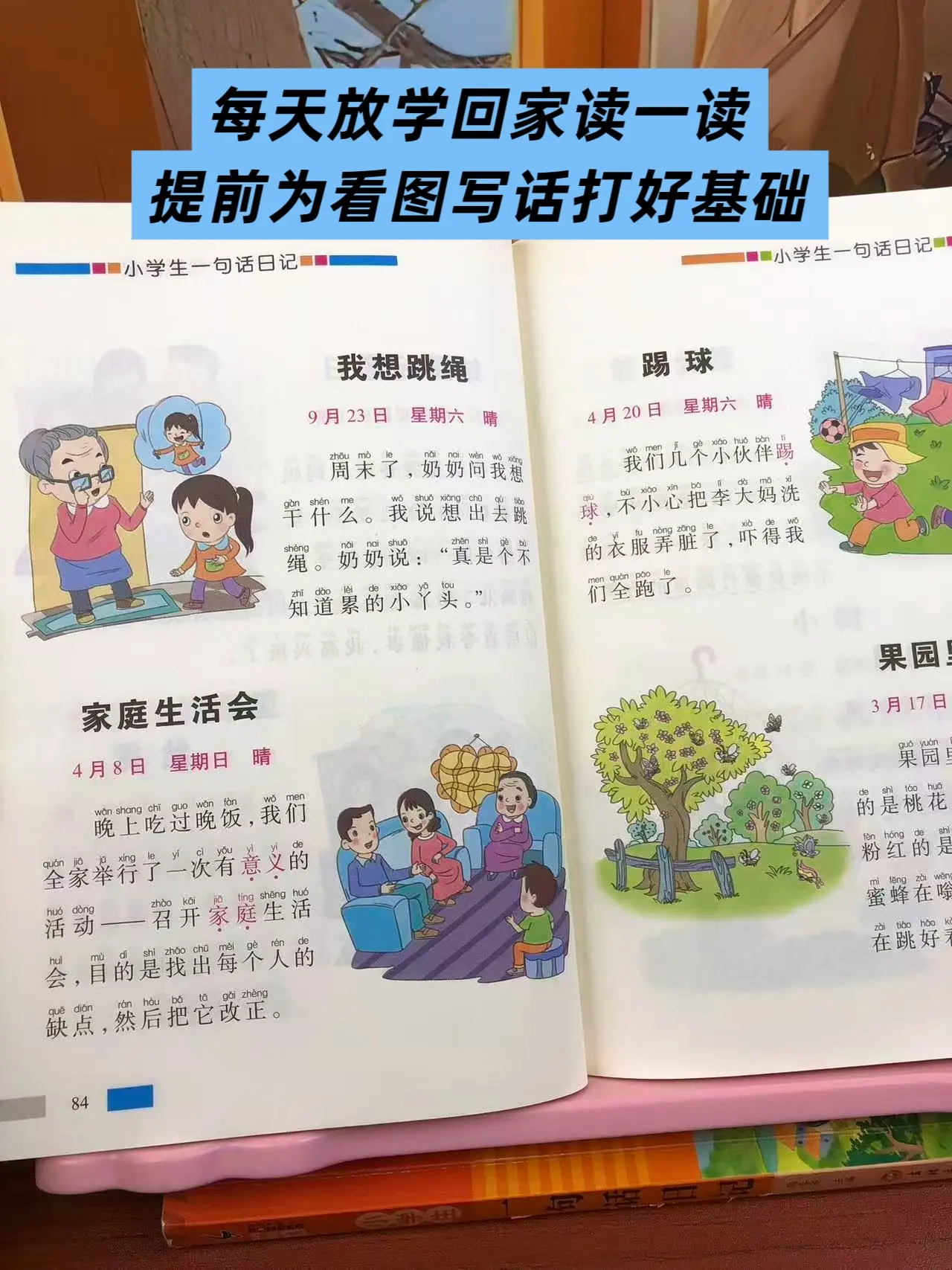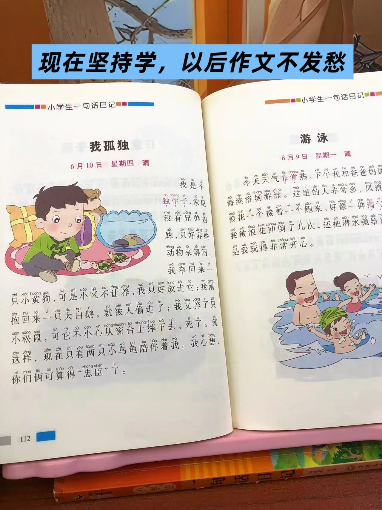 女儿一年级的时候,每天都两页一句话日记,积累写作素材,提升写作能力。