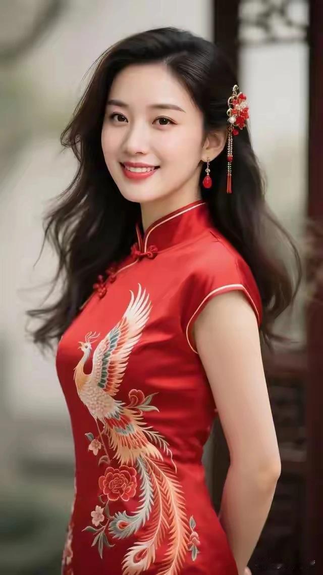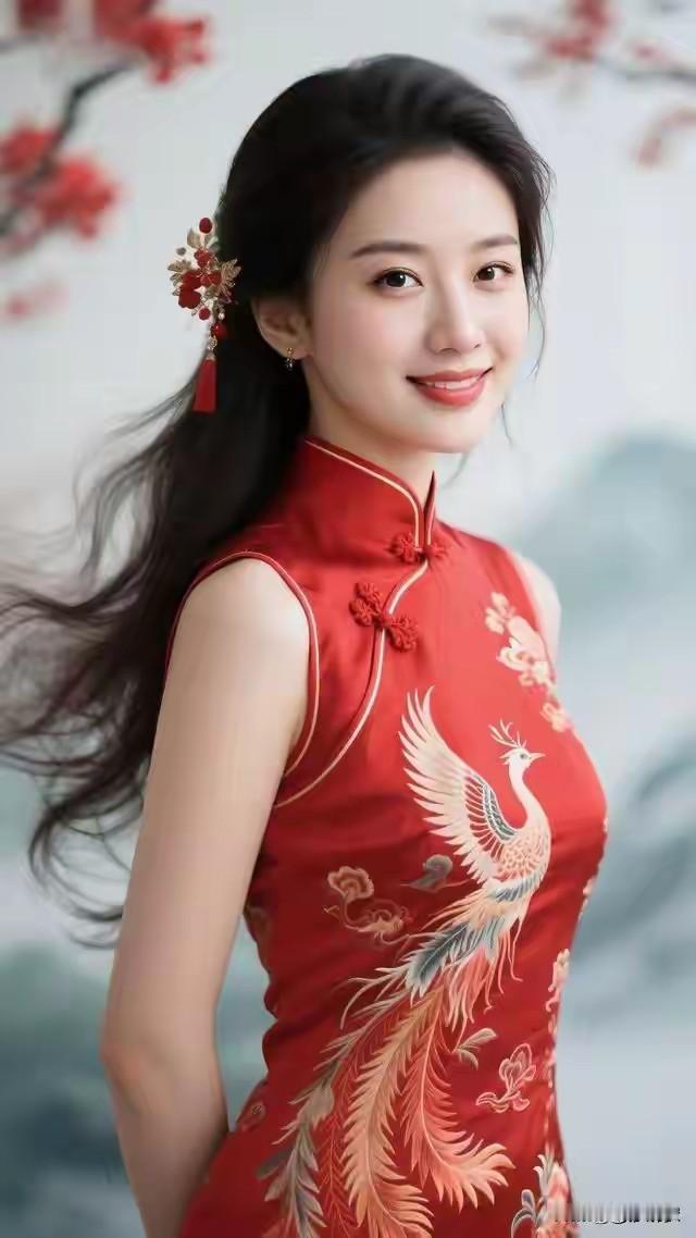 旗袍雅致衬娇容, 红底凤凰显风情。 青丝如瀑随风舞。 恰似春风拂柳轻。 中国旗袍