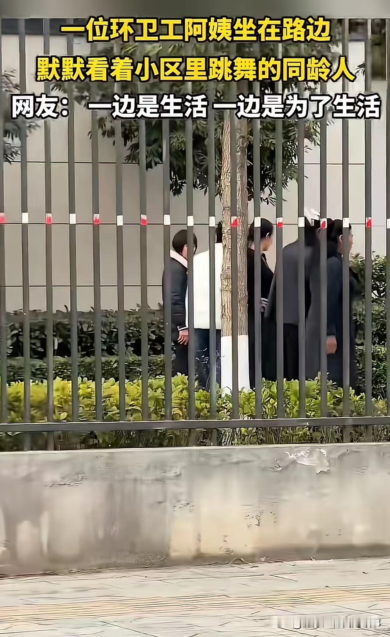 太心酸!环卫阿姨路边驻足看广场舞,一句话戳中无数人 一位环卫阿姨,干完活坐在路边,静静看着小区里跳舞的同龄人。 她没说话,只是满眼羡慕。 别人跳舞是享受生活, 她扫地是为了生活。 同样的年纪,不一样的人生。 网友破防: - 都是为生活奔波,只是岗位不同,凭什么晚年差距这么大? - 她也想跳,可生活不允许。 - 最脏最累的活,往往待遇最低。 很多人留言呼吁: 建议不论工种,退休后养老金、福利、待遇一视同仁! 每一份劳动都该被尊重,每一个晚年都该有尊严。 素材来源于网络