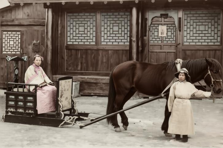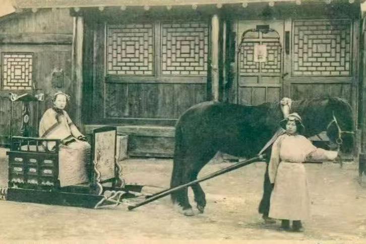 这张清末老照片极为生动地还原了清代贵族女性的冬季出行场景,图中这种马拉的豪华出行