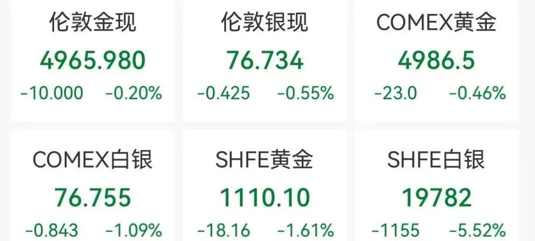 国际贵金属方面,黄金白银由涨转跌,截至发稿,现货黄金回落至4970美元下方,现货白银跌至76.734美元/盎司。昨夜现货黄金剧烈波动,一度站上5000美元关口,短线跳水至4960美元附近;现货白银一度大涨6%,突破78美元/盎司。