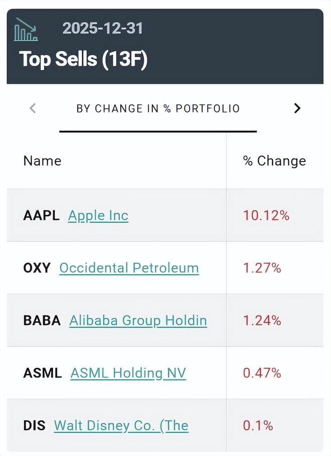 13F文件显示,2025年四季度,段永平减持了苹果、西方石油、阿里巴巴、迪士尼、阿斯麦等多只股票。