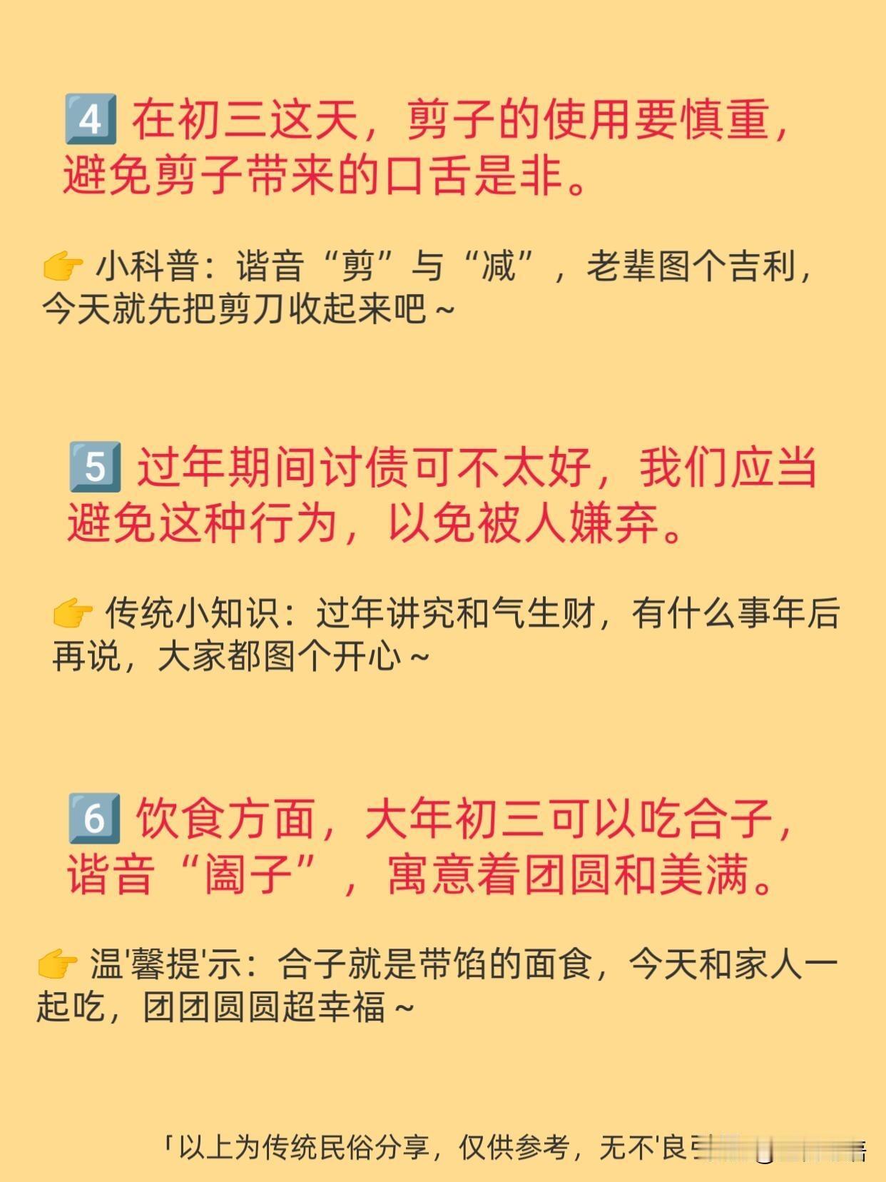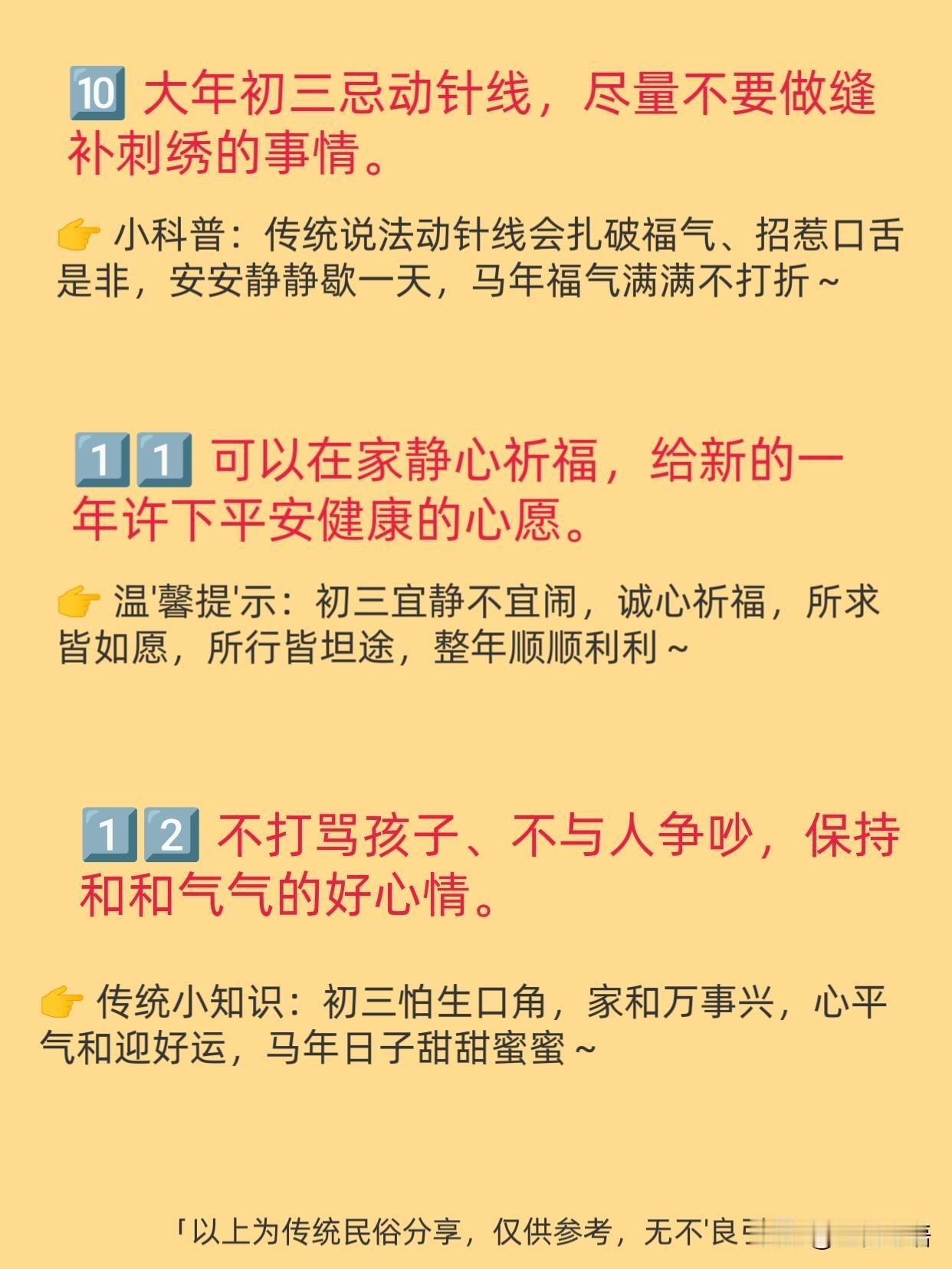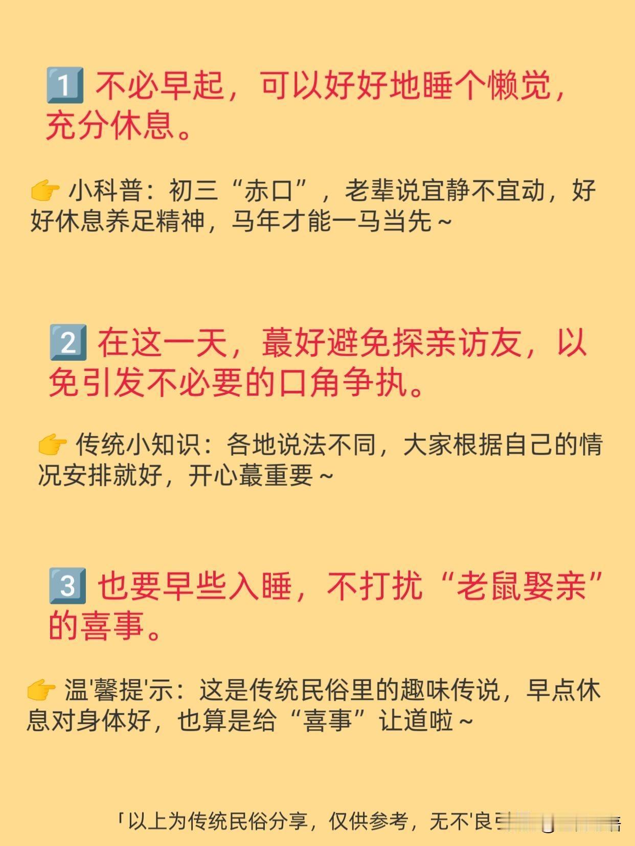 马年初三,终于可以理直气壮地“躺平”了! 这一天的老习俗, 简直是为当代年轻人量身定制的。 主打一个“歇”。 不拜年、不串门, 在家睡个自然醒,完全不用有心理负担。 贴“赤口”,挂红布, 把一年的口舌是非都挡在门外。 吃“合子”,寓意团团圆圆,日子过得有滋有味。 还有个说法叫“老鼠娶亲”。 晚上早点熄灯, 不打扰小家伙们的喜事,图个五谷丰登。 这哪里是迷信, 分明是老祖宗传下来的“休息指南”。 忙完了初一初二, 初三就是给生活“充电”的日子。 这种慢下来的年味,才最让人舒服。 遵循传统,好好爱自己, 这才是初三该有的打开方式!
