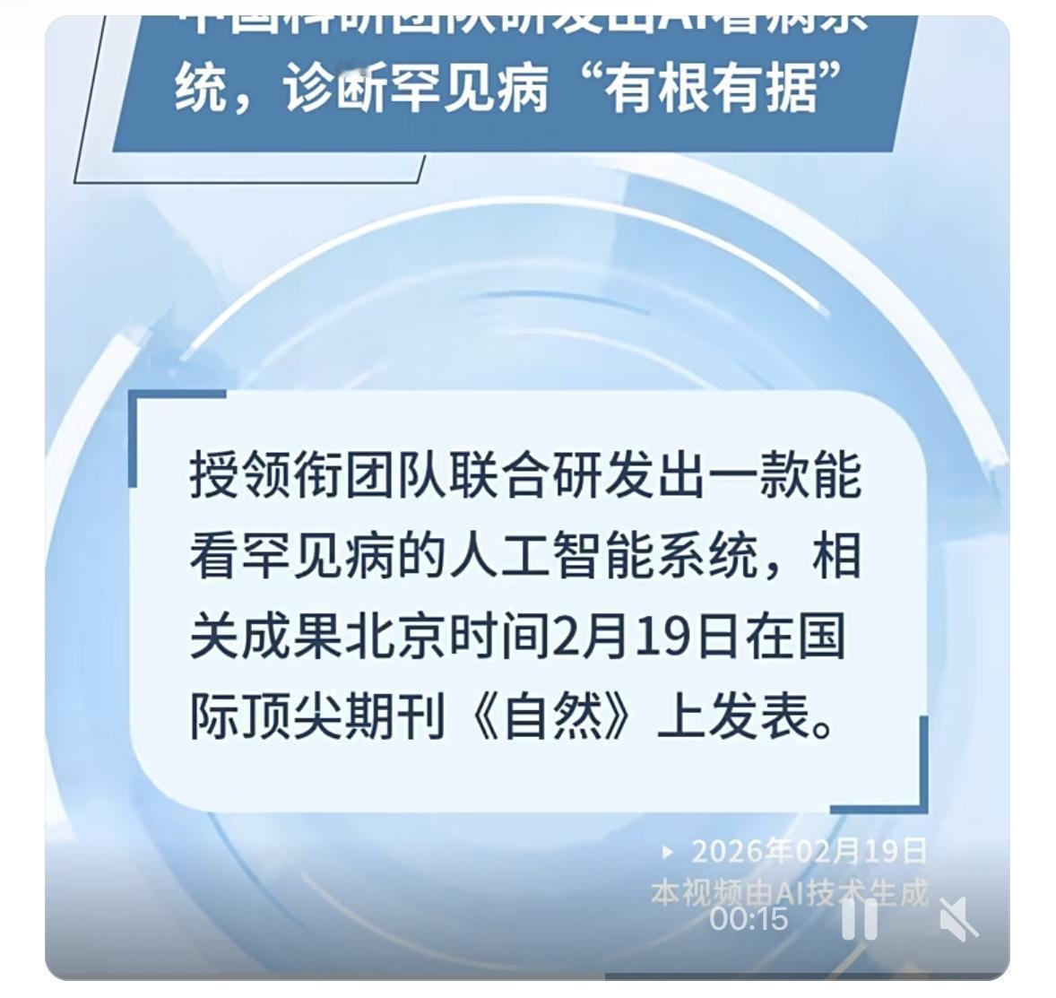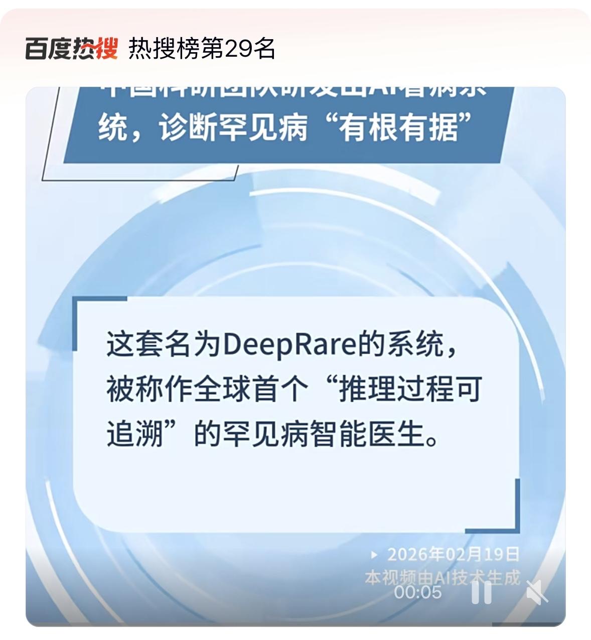 2月19日,上海交通大学医学院附属新华医院孙锟、余永国团队与上海交通大学张娅、谢伟迪团队联合研发的DeepRare系统在《自然》发表。该系统为全球首个"推理过程可追溯"的罕见病AI医生,临床诊断准确率达57.18%(无基因数据),较国际最优模型提升24个百分点。