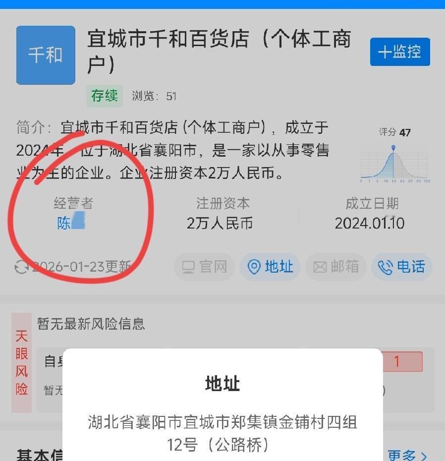 湖北千和烟花店经营者,通报说姓林,可是网上工商注册显示,却姓陈,应该换人了,林某