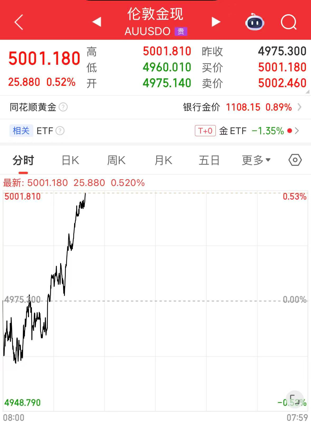 2月19日,现货黄金再次站上5000美元/盎司,日内涨0.52%。