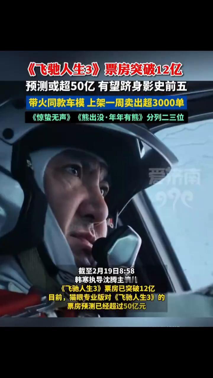 《飞驰人生3》票房突破12亿,预测或超50亿有望跻身影史前五。 带火同款车模上架一周卖出超3000单,《惊蛰无声》、《熊出没·年年有熊》分列二三位。春节档的热度仍在持续发酵,其衍生品市场也迎来了爆发式增长。 截至2月19日8:58,韩寒执导沈腾主演的《飞驰人生3》票房已突破12亿。目前,猫眼专业版对《飞驰人生3》的票房预测已经超过50亿元。在电影持续引爆观影热潮的同时,片中主角张驰的座驾以奥迪A3为原型的拉力赛车也掀起了一股"收藏热"。 电商平台上一款名为"拓意飞驰人生3,奥迪A3拉力赛车1:64"的官方联名车模售价129.9元,该产品上线时间为2月13日。截至发稿,车模已售出超3000单,24小时内已有500人购买。客服告诉记者,飞驰人生的上映给车模带来了大量的关注度,首批现货车模已售罄。目前店铺内下单的车模均为预售,所有预售订单需要等到3月底才能陆续发货。
