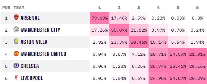 最新的预测结果中,阿森纳的夺冠概率已经从2月初的超90%,下滑到了现在的79.69%,下滑超过10个百分点。