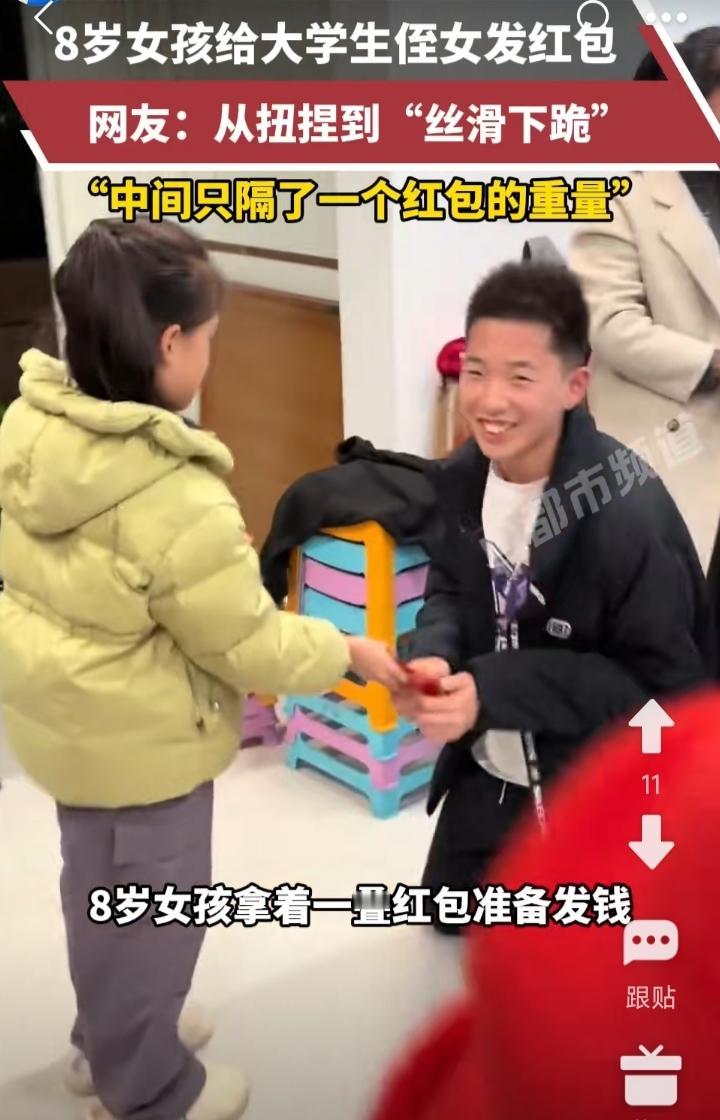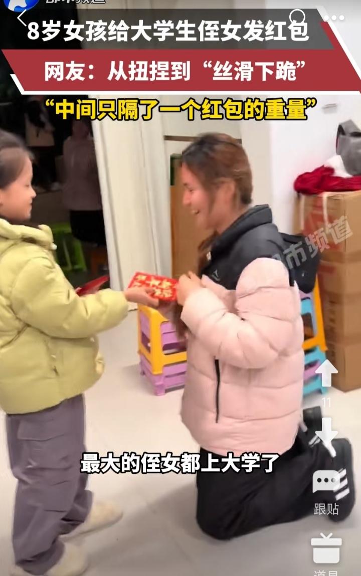 过年发红包,一般都是老的给少的发,大的给小的发。 可凡事无绝对。 这个才二年级的小学生,却要给她的外甥们发红包。最大的外甥已经是大学生了,还得下跪向小学生磕头,双手恭恭敬敬接过红包。 其中一个外甥年纪只比她大一两年,每天都和她一起上下学。他耍赖说,咱们这么熟,不用磕头了吧?谁知长辈不依。他还是恭恭敬敬的磕了三个头。 谁叫她是他的姑奶奶呢!
