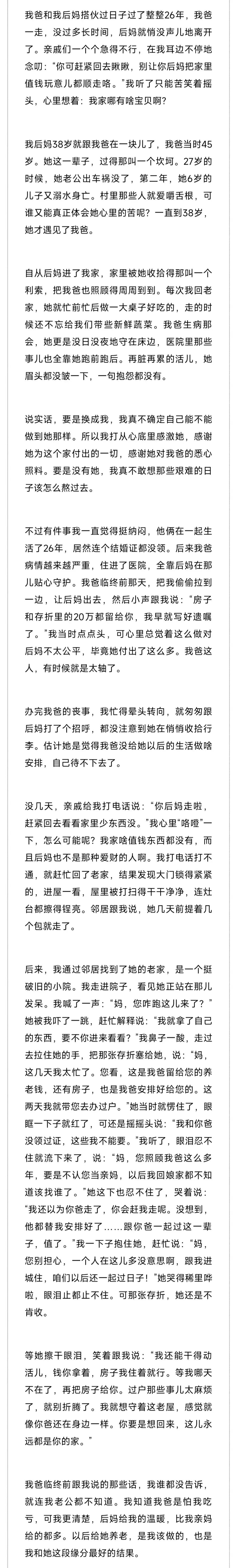 我爸和我后妈搭伙过日子过了整整26年,我爸一走,没过多长时间,后妈就悄无声儿地离