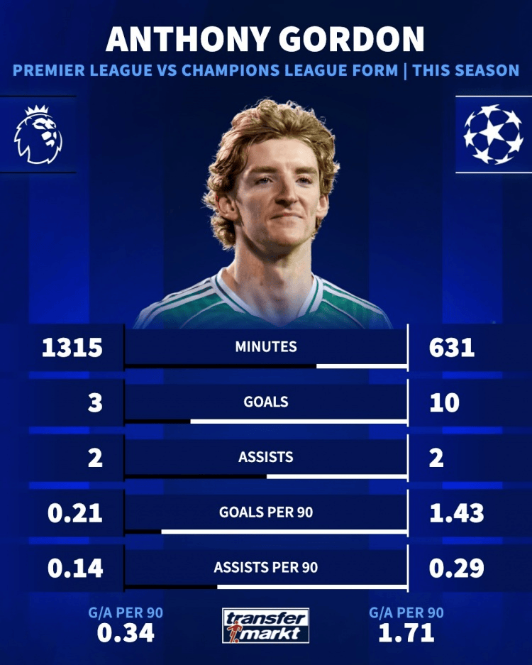 德国转会市场对比了戈登本赛季在英超联赛、欧冠联赛的数据。