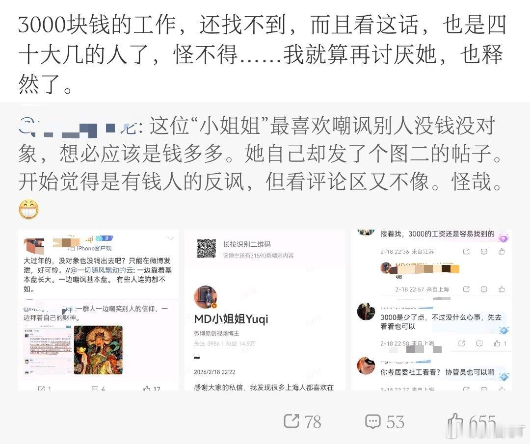 但自己没工作,还爱嘲讽别人没钱又找不到对象,我就不太能理解了。