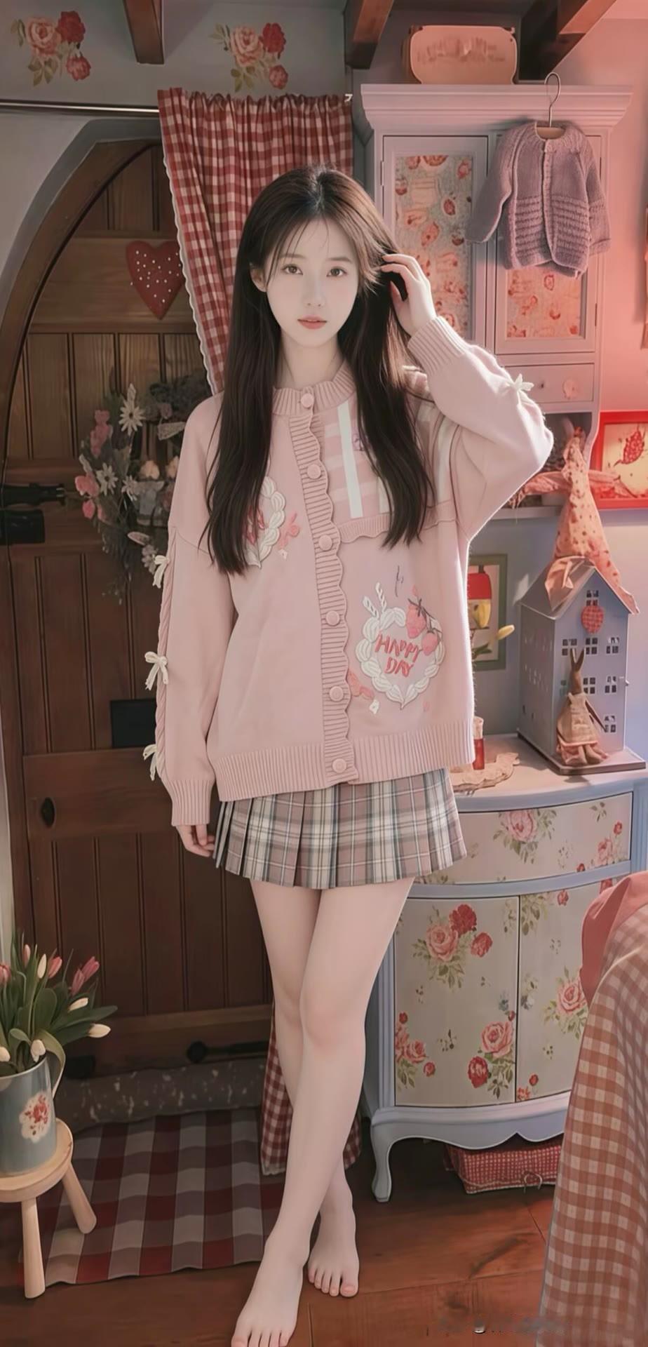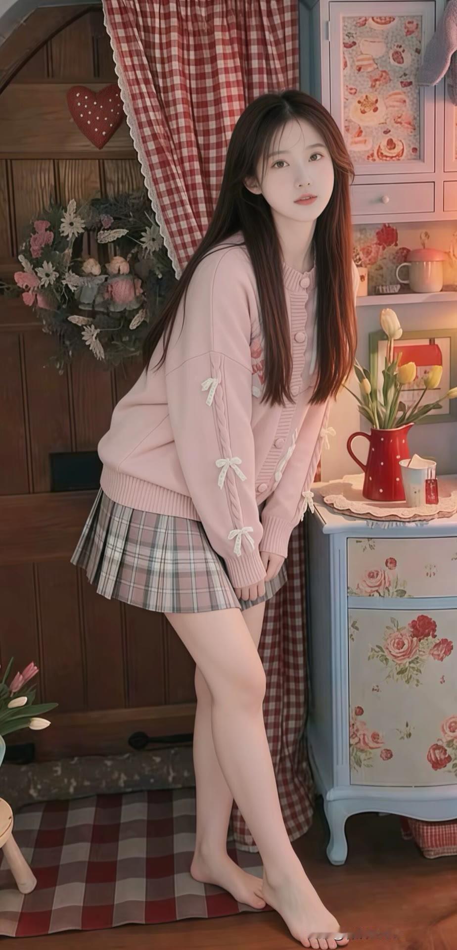 少女心爆棚的粉色毛衣,搭配格子裙,温馨的家居背景,元气满满的一天!🌸💕甜美女