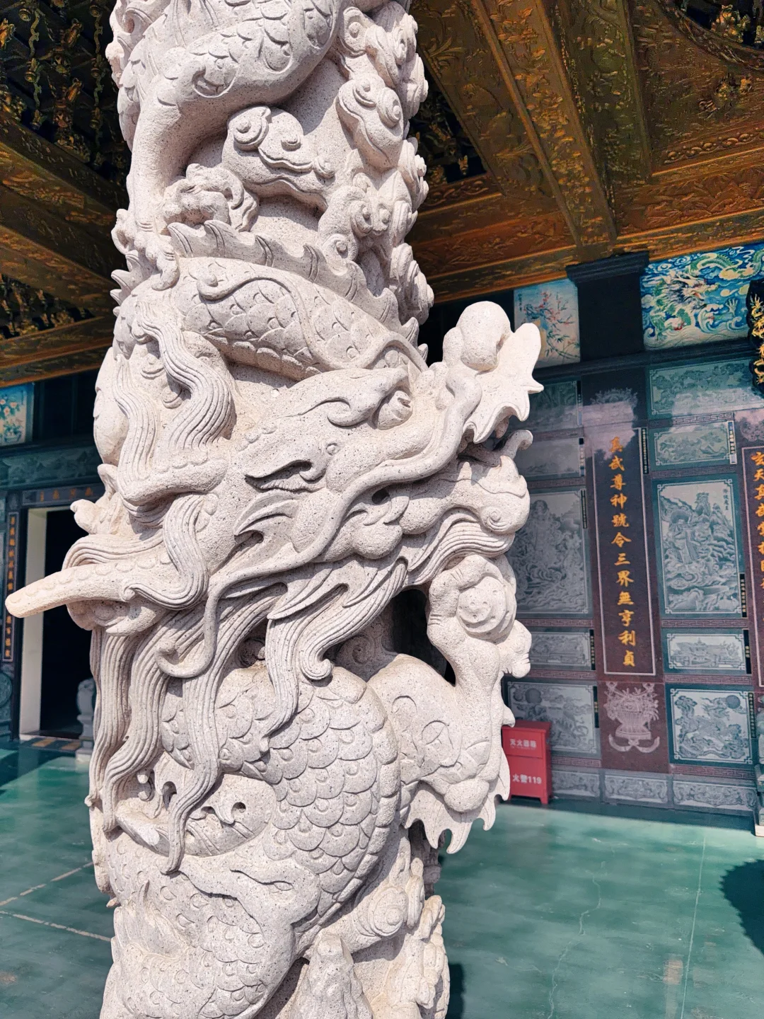 [拔草R]入口处立有盘龙柱,柱身雕刻多层龙纹,龙首昂扬、鳞爪分明,工艺精湛,是整座宫观最具视觉冲击力的构件。