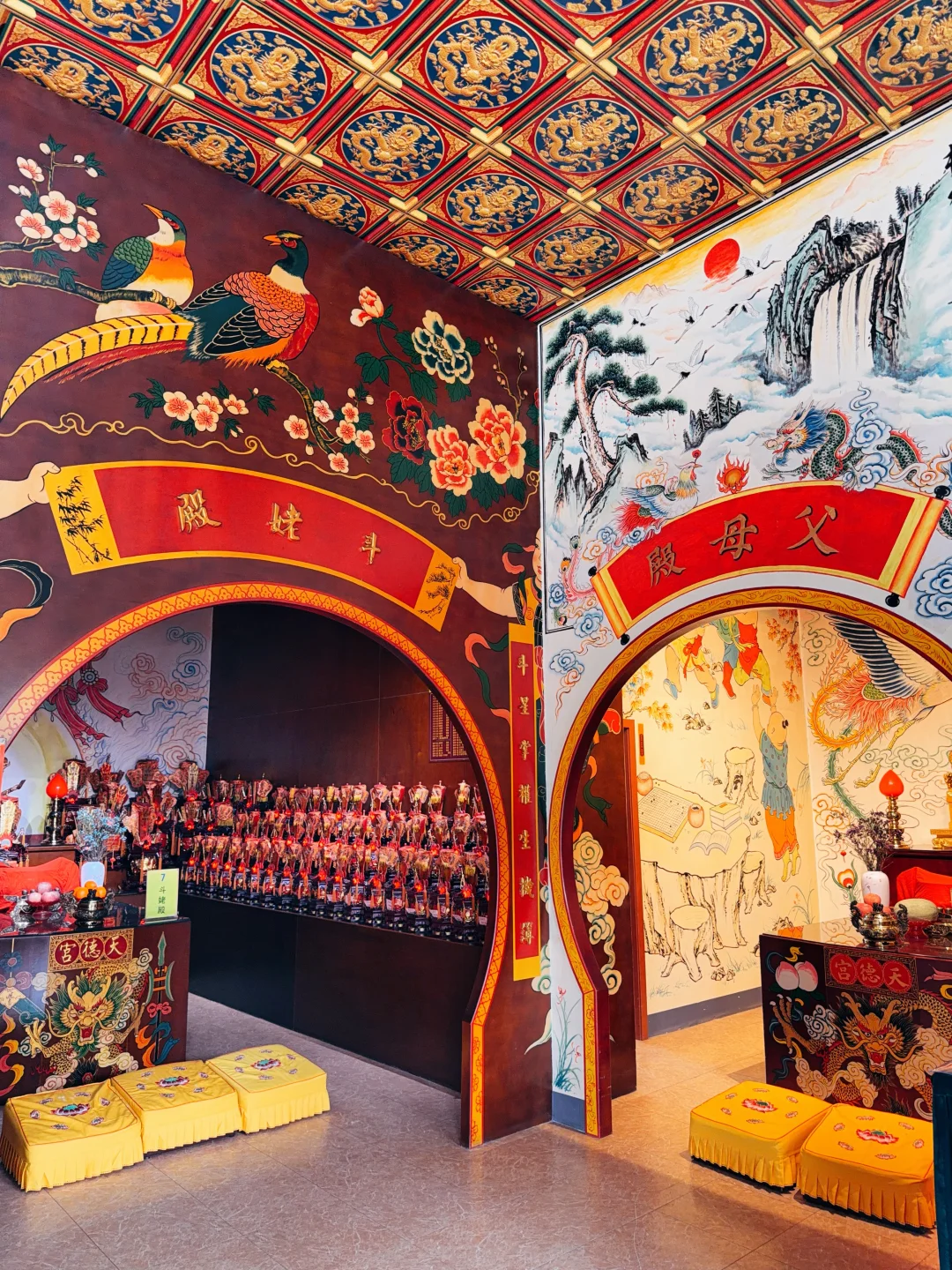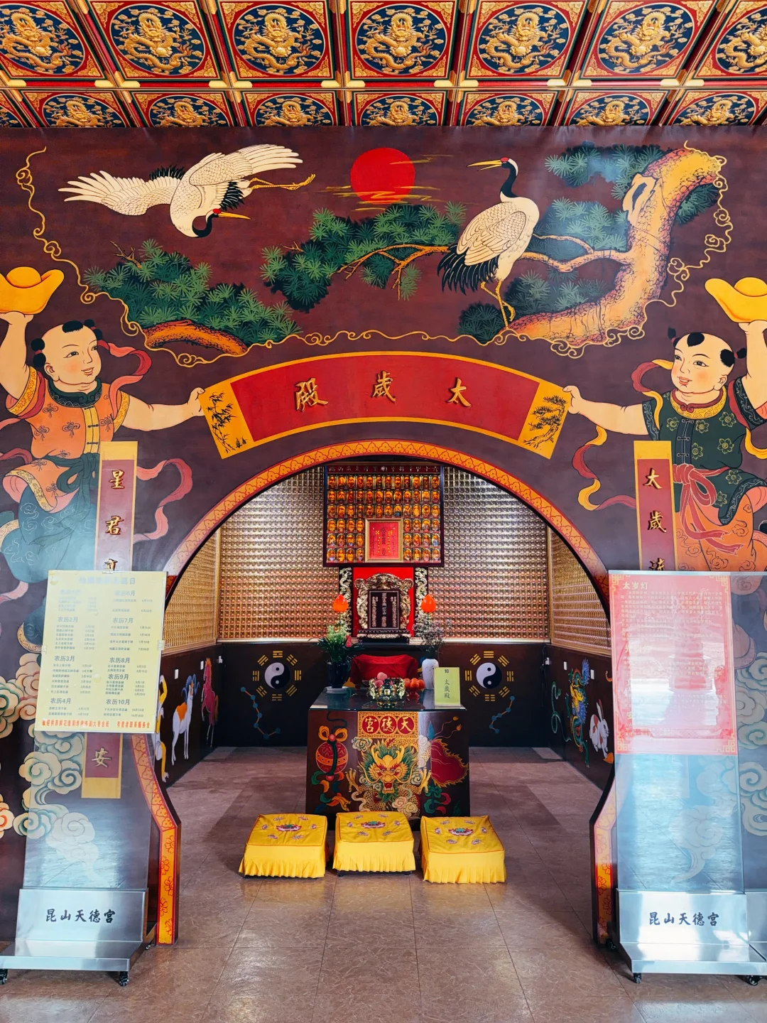 [拔草R]门楣悬挂“天德宫”红底金字匾额,上方是鎏金藻井,由数百尊小神像和瑞兽组成,金碧辉煌。