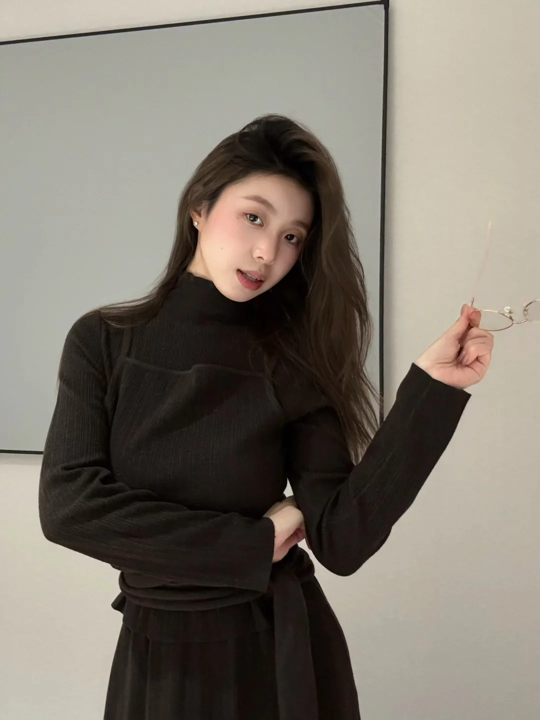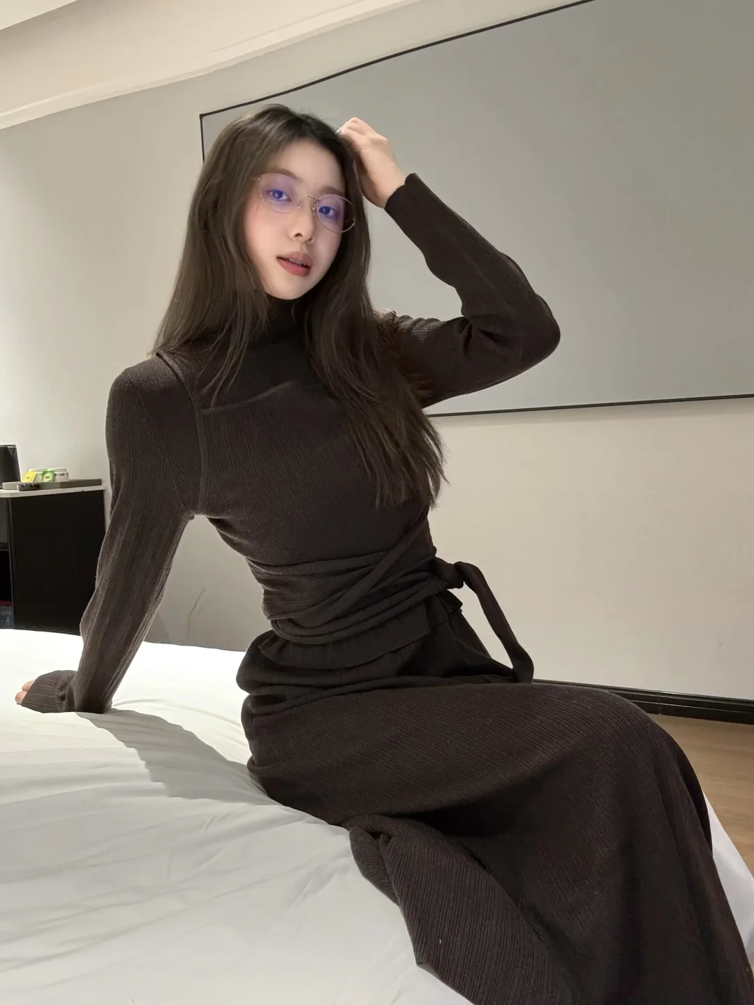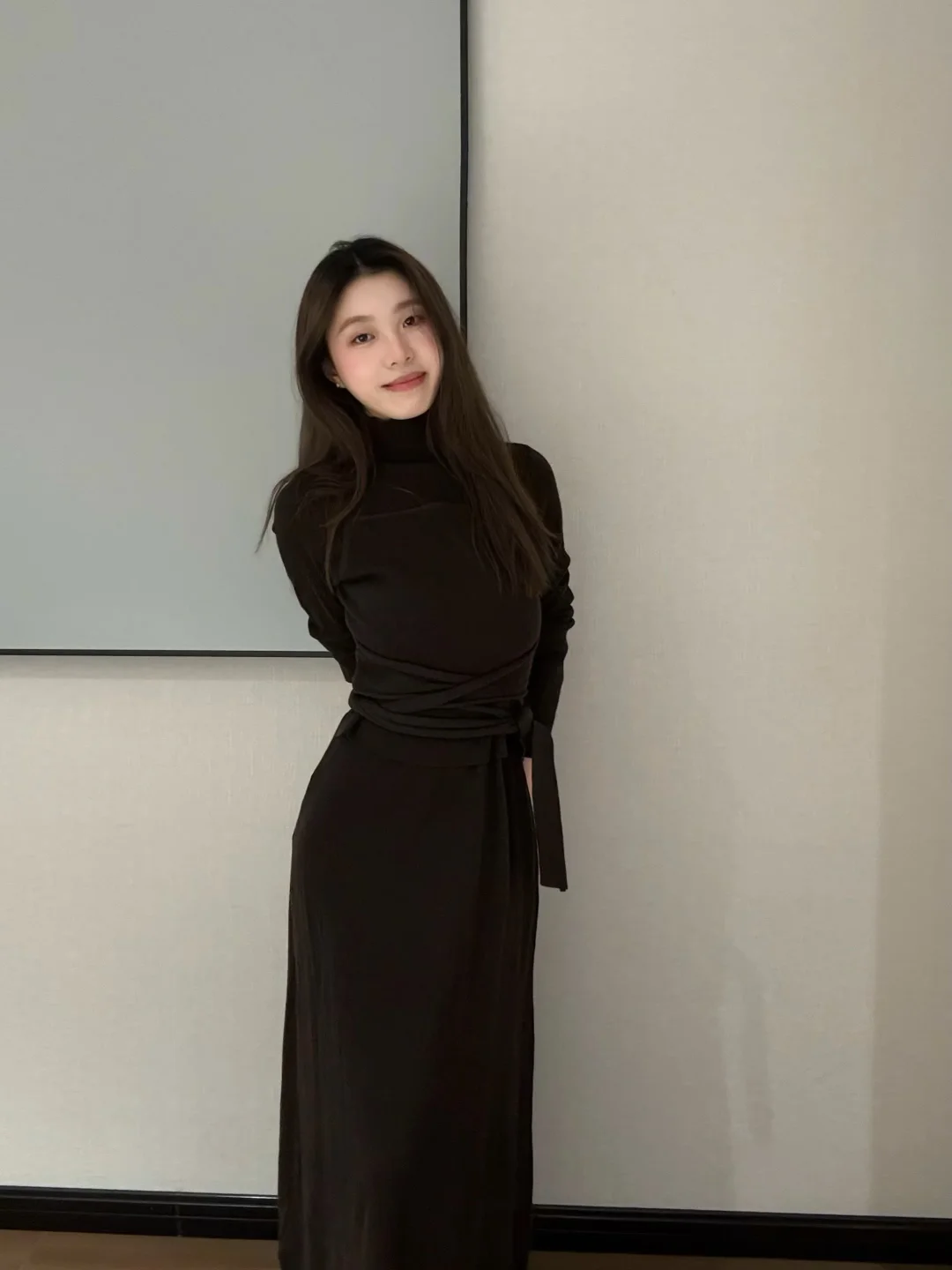 深棕针织裙真的太显气质了✨ 高领+交叉绑带设计,把腰线掐得刚刚好 不管是站着还是窝在床边,都自带慵懒松弛感 眼镜一戴,又多了几分知性温柔 秋冬氛围感直接拉满,温柔又不刻意~