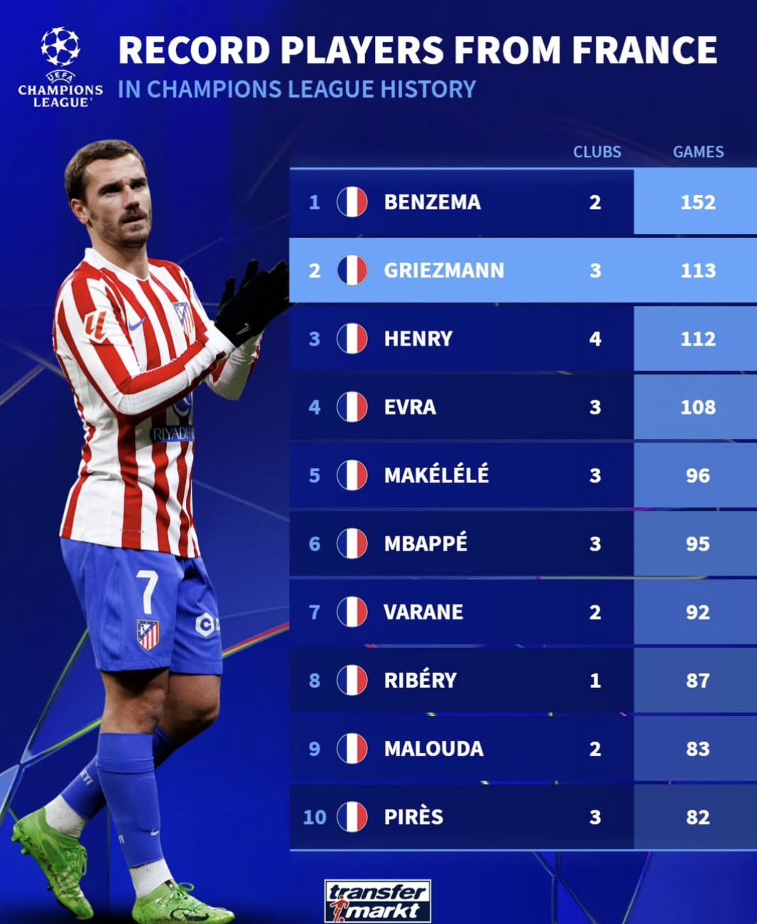 本泽马总共在欧冠出场152次居首;格里兹曼出场113次,超越112次的亨利排名第二。