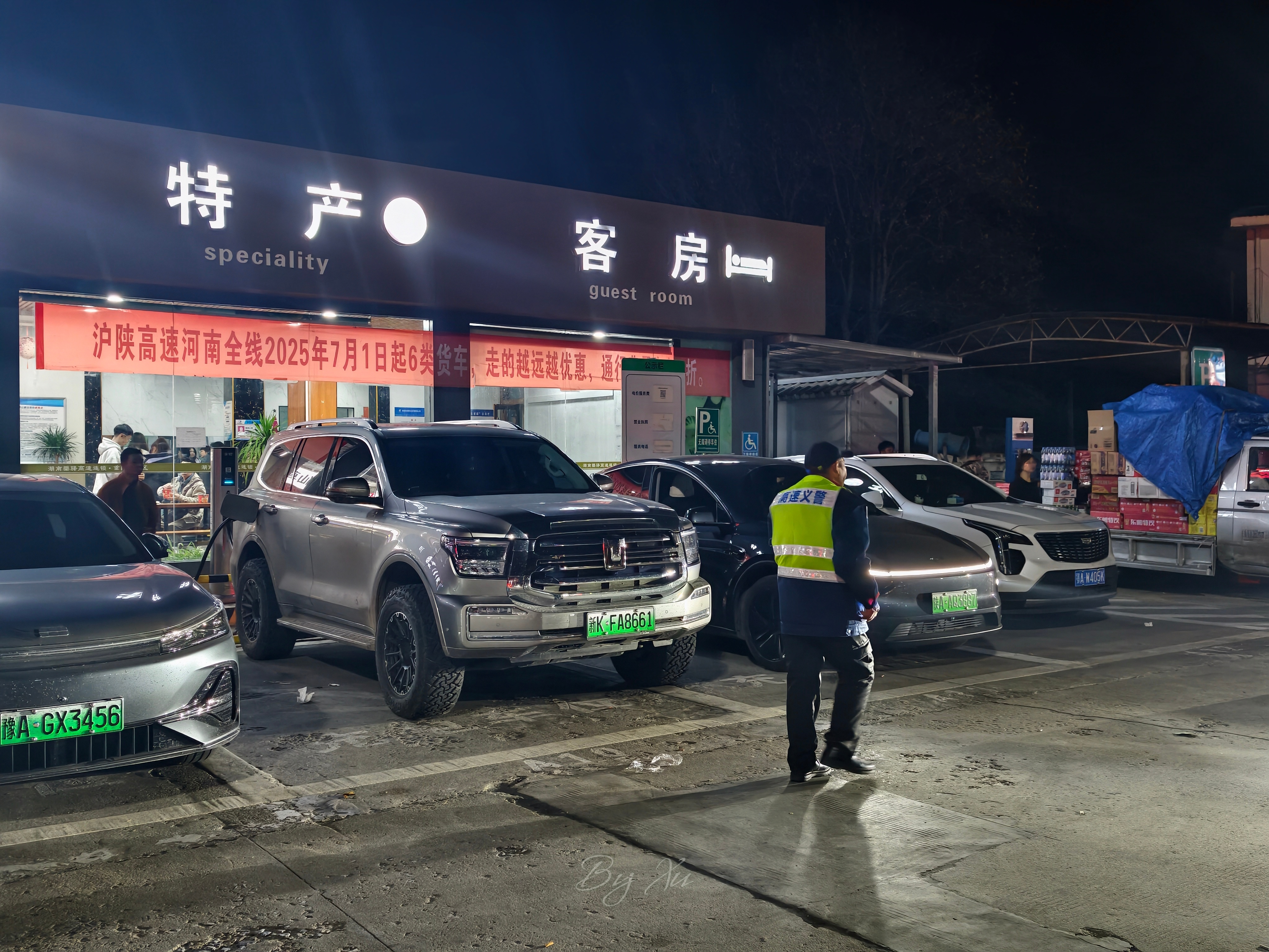 河南重阳服务区还挺好的安排了个专人负责管理充电车位避免了油车占位和电车抢充电桩现象